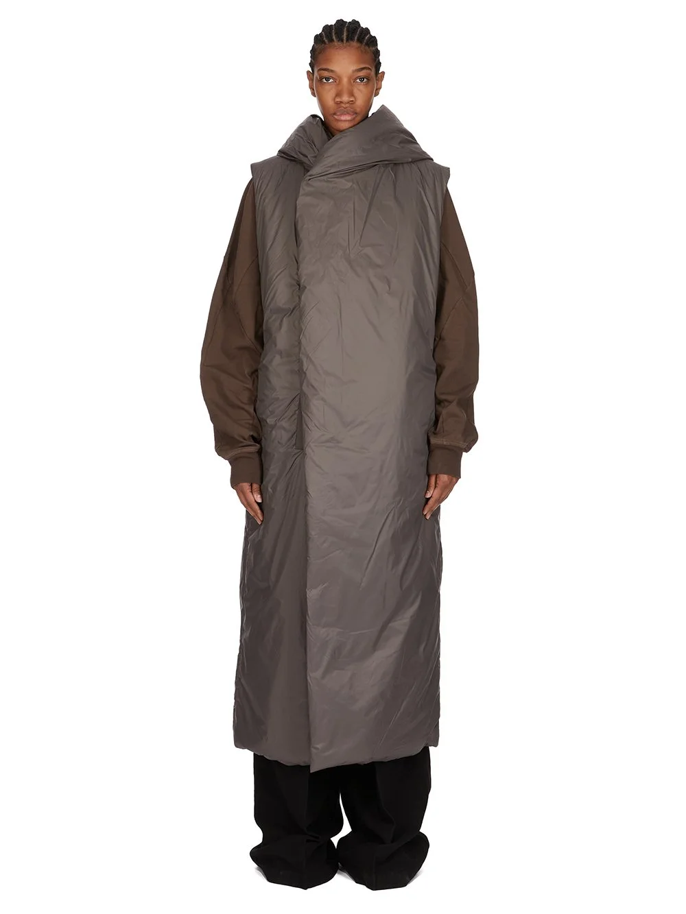 DRKSHDW FW25 CONCORDIANS HOODED LINER IN BRONZE RECYCLED NYLON THIS HOODED LINER IS BELOW KNEE LENGTH AND SLEEVELESS. IT FEATURES OFF-CENTER FRONT CONCEALED SNAP CLOSURES, A HOOD, SIDE WELT POCKETS AND A COTTON WEBBING STRAP WITH RIVET DETAIL ACROSS THE BACK. IT IS FULLY LINED WITH INTERNAL QUILTING AND TWO SNAP POCKETS. THIS AIRY AND LIGHTWEIGHT NYLON IS MADE USING GRS CERTIFIED RECYCLED NYLON WHICH ENSURES A REDUCTION IN WATER CONSUMPTION, EMISSIONS AND HAZARDOUS WASTE, LESSENING THE DEPENDENCE ON NON-RENEWABLE RESOURCES COLOR: BRONZE MATERIAL: 100% NYLON MODEL IS 181CM TALL MODEL WEARS SIZE S