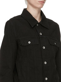 DRKSHDW SS25 HOLLYWOOD TRUCKER IN BLACK COTTON CANVAS THIS TRUCKER JKT IS ABOVE HIP LENGTH. IT HAS A CENTRE FRONT PLACKET WITH VISIBLE BUTTON CLOSURES, A CLASSIC COLLAR, TWO CHEST POCKETS WITH FRAYED OUTER FLAP EDGES AND BUTTONS AND SIDE SEAM POCKETS. IT HAS LONG SLEEVES WITH BUTTONED CUFFS, SIGNATURE LEVEL SHOULDER SEAMS, A FRONT AND BACK YOKE AND VERTICAL SEAMED PANELS WITH DOUBLE TOP STITCHING THIS MEDIUMWEIGHT COTTON CANVAS IS COMPACT WITH A SOFT HANDFEEL. THIS GARMENT HAS BEEN GARMENT DYED. THIS FABRIC IS MADE USING GOTS CERTIFIED ORGANIC COTTON WHICH MEANS THE NATURAL FIBER IS GROWN WITHOUT HARMFUL CHEMICALS, LEAVING OUR SOIL, AIR AND WATER CLEANER FROM CONTAMINATES COLOR: BLACK MATERIAL: 100% COTTON POCKETS LINING 52% POLYESTER + 48% COTTON MODEL IS 181CM TALL MODEL WEARS SIZE M