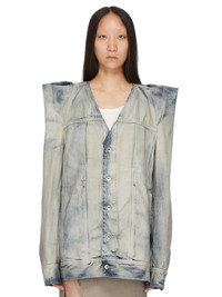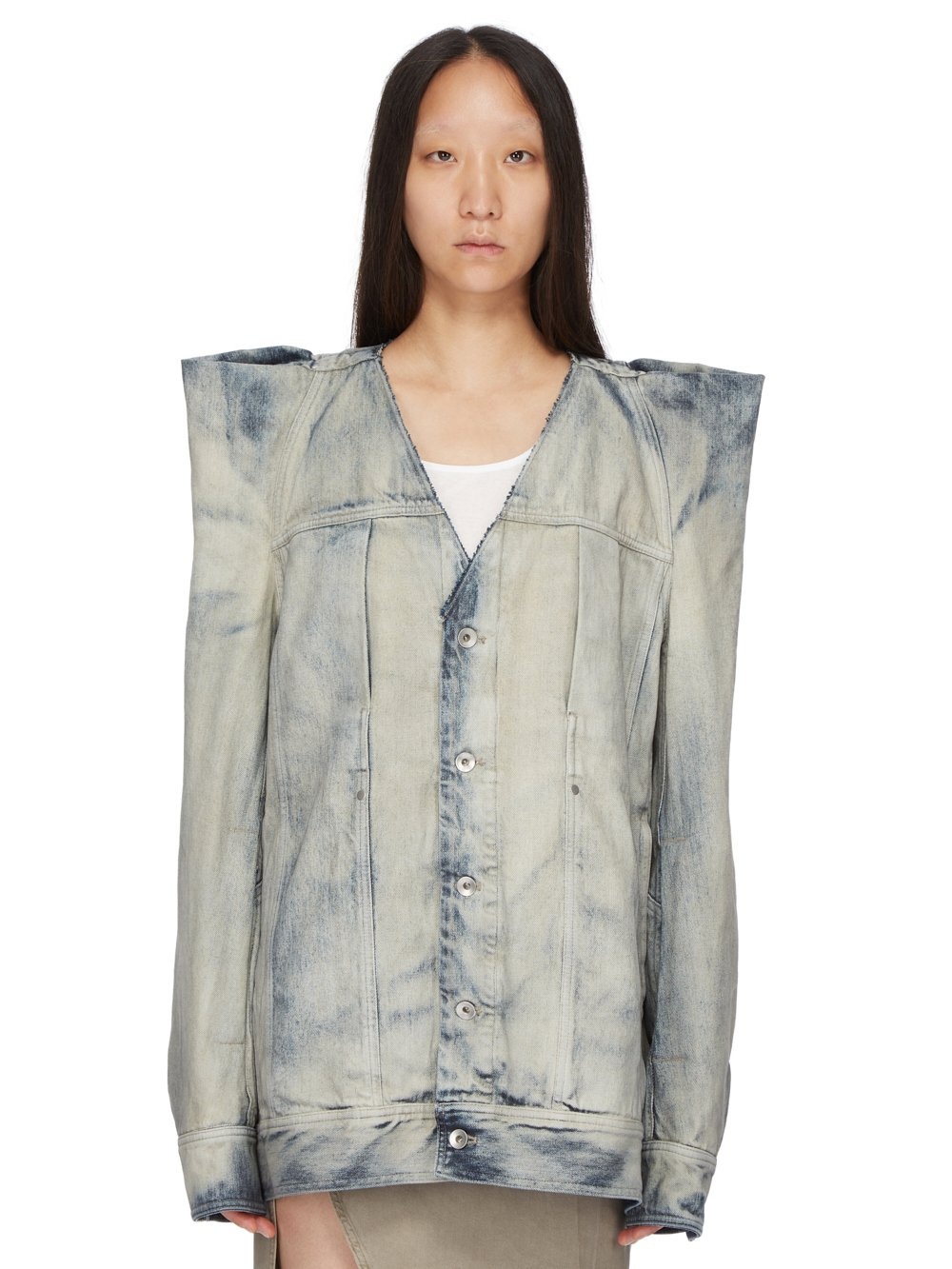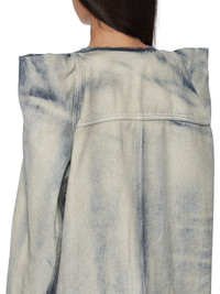 DRKSHDW SS24 LIDO TEC WORKER IN SKY 13OZ SKY DENIM THIS TEC WORKER JACKET IS BELOW HIP LENGTH AND JUMBO OVERSIZED WITH LONG SLEEVES. IT HAS A CENTRE FRONT PLACKET WITH VISIBLE BUTTONS, A FRONT YOKE AND A RAW CUT COLLAR CREATING A V NECK. IT FEATURES EXAGGERATED TEC SHOULDERS WHICH RISE INTO RAW CUT POINTS. IT HAS TWO, VERTICAL FOG POCKETS WITH SNAPS ON THE CHEST AND HORIZONTAL SEAMS WITH SIDE FRONT POCKETS, A WAISTBAND HEM WITH BUTTON DETAIL, BUTTONED CUFFS, AND DOUBLE TOP STITCHING ON ALL SEAMS.IT IS UNLINED WITH TWO INTERNAL POCKETS THIS ITEM CAN BE WORN OVER ANY OF OUR TEC T, OR TECSWEATS, OR THE SHOULDERS CAN BE WORN TUCKED IN, TO GIVE THE EFFECT OF A REGULAR WORKER JACKET, WITH A SQUARE SHOULDER THIS 13OZ INDIGO JAPANESE SELVEDGE DENIM IS STONE WASHED AND THEN OVERDYED WITH MINERALS TO CREATE THE SKY COLORATION. THIS GARMENT IS TREATED IN AN ITALIAN WASH HOUSE BASED IN THE VENETO AREA OF ITALY, THAT PRODUCES IN SMALLER TREATMENT BATHS TO REDUCE WATER WASTE AND UTILIZE A WATER PURIFYING PROCESS THAT ENABLES THEM TO RECYCLE A PORTION OF THE WATER USED. ALL OF OUR DENIM WASHES ARE ZDHC CERTIFIED - COLOR: SKY - MATERIAL: 100% COTTON - POCKETS LINING 52% POLYESTER + 48% COTTON - MODEL IS 181CM TALL - MODEL WEARS SIZE S