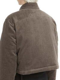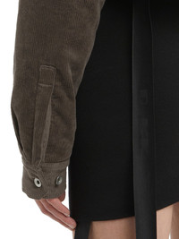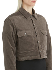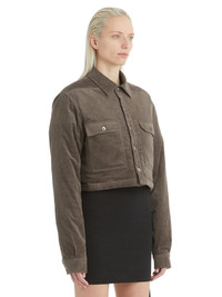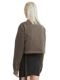 DRKSHDW FW22 STROBE CROPPED OUTERSHIRT IN STRETCH CORDUROY THIS CROPPED OUTERSHIRT IS WAIST LENGTH AND HAS A STRAIGHT FIT. IT HAS A CENTRE FRONT PLACKET WITH VISIBLE METAL BUTTONS, A CLASSIC COLLAR AND SQUARE CHEST POCKETS WITH BEVELED CORNER FLAPS AND BUTTONS. IT HAS LONG SLEEVES WITH BUTTONED CUFFS, SIGNATURE LEVEL SHOULDER SEAMS, A BACK YOKE AND DOUBLE TOP STITCHING ON ALL SEAMS THIS MEDIUMWEIGHT STRETCH CORDUROY IS WOVEN FROM GOTS CERTIFIED ORGANIC COTTON FROM A LOCAL ITALIAN MILL THAT WAS FOUNDED IN 1597. WE CHOSE TO MAKE THIS GARMENT USING CERTIFIED ORGANIC COTTON BECAUSE IT MEANS THE NATURAL FIBER IS GROWN WITHOUT HARMFUL CHEMICALS, WHICH LEAVES OUR SOIL, AIR AND WATER CLEANER FROM CONTAMINATES - COLOR:DUST - MATERIAL: 97% COTTON + 3% ELASTANE - BODY LINING 100% COTTON - SLEEVES LINING 100% NYLON - MODEL IS WEARING SIZE S - MODEL IS 181 CM TALL