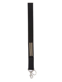 DRKSHDW FW24 PORTERVILLE KEYCHAIN IN BLACK/MILK COTTON WEBBING THIS KEYCHAIN HAS A SHORT STRAP ATTACHED TO A PALLADIO SILVER TONE SNAP CLIP AND A ROUND KEYRING. IT IS PRINTED WITH A CONTRAST DRKSHDW LOGO THIS MATERIAL IS A THICK WOVEN COTTON WEBBING - COLOR: BLACK/MILK - MATERIAL: 100% COTTON - MEASUREMENTS: LENGTH 59CM / WIDTH 5,5CM
