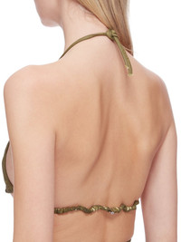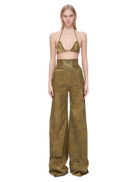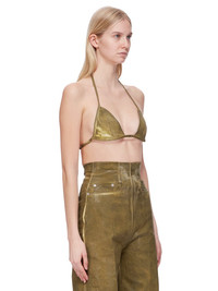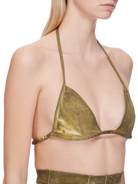 DRKSHDW FW24 PORTERVILLE BRA IN SAGE FOIL STRETCH DENIM THIS BRA IS A TRIANGLE SHAPE WITH THIN STRAPS THAT RUN ACROSS THE BACK AND TIE TO SECURE, HALTER STYLE, BEHIND THE BACK NECK THIS LIGHTWEIGHT STRETCH DENIM IS OVERDYED WITH A CLEAR FOIL OVERLAY THAT CREATES THE WAXY TOUCH SINCE THE FOIL IS PRESSED ON TOP OF THE FINAL GARMENTS, EACH PIECE WILL HAVE ITS OWN UNIQUE LOOK AND CREASES SINCE THE FOIL WILL ATTACH TO DIFFERENT PLACES DEPENDING ON THE GARMENT. THIS GARMENT IS TREATED IN AN ITALIAN WASH HOUSE BASED IN THE VENETO AREA OF ITALY, THAT PRODUCES IN SMALLER TREATMENT BATHS TO REDUCE WATER WASTE AND UTILIZE A WATER PURIFYING PROCESS THAT ENABLES THEM TO RECYCLE A PORTION OF THE WATER USED. ALL OF OUR DENIM WASHES ARE ZDHC CERTIFIED - COLOR: SAGE - MATERIAL: 85% COTTON + 10% POLYESTER + 5% ELASTANE - LINING 100% COTTON - MODEL IS 181CM TALL - MODEL WEARS SIZE S