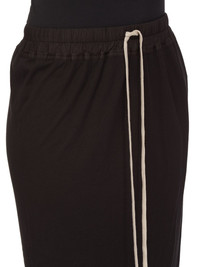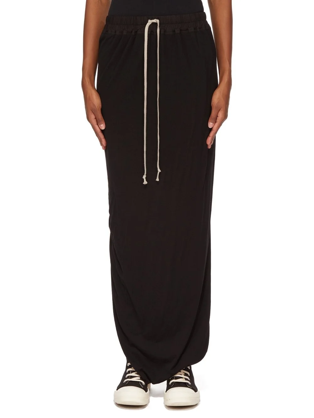 DRKSHDW SS25 HOLLYWOOD PULL ON PILLAR SKIRT IN BLACK COTTON GAUZE JERSEY THIS PULL ON PILLAR SKIRT IS FULL LENGTH AT FRONT AND OPEN TO KNEE HEIGHT AT THE REAR. IT HAS AN ELASTICIZED WAISTBAND WITH DRAWSTRING AND TWO SIDE FRONT POCKETS. THE SKIRT WRAPS TO THE BACK, CREATING A CENTRE BACK SPLIT OPENING AND DRAPING EFFECT THIS LIGHTWEIGHT AND AIRY COTTON GAUZE JERSEY IS SEMI TRANSPARENT AND HAVE A SOFT WASHED HANDFEEL. THE COLOR OF THIS JERSEY IS NATURAL WITH VISIBLE SLUBS AND IMPURITIES NATURAL TO THE COTTON FIBRE. THIS JERSEY IS GARMENT WASHED THIS FABRIC IS MADE USING GOTS CERTIFIED ORGANIC COTTON WHICH MEANS THE NATURAL FIBER IS GROWN WITHOUT HARMFUL CHEMICALS, LEAVING OUR SOIL, AIR AND WATER CLEANER FROM CONTAMINATES COLOR: BLACK MATERIAL: 100% COTTON MODEL IS 181CM TALL MODEL WEARS SIZE S