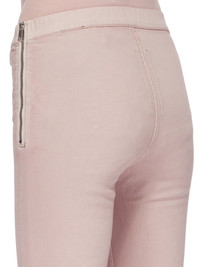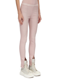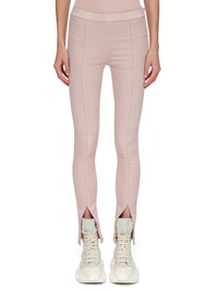 RICK OWENS SS23 EDFU SLIT FRONT LEGGINS IN FADED PINK OVERDYED STRETCH DENIM THESE SLIT FRONT LEGGINGS ARE FULL LENGTH WITH A SNUG FIT. THEY HAVE AN ELASTICIZED WAISTBAND WHICH SECURES WITH A SIDE ZIPPER ON THE LEFT HIP. THEY FEATURE SEAMS RUNNING DOWN THE CENTRE FRONT LEG, AND A SLIT OPENING ON THE FRONT SHINS THIS LIGHTWEIGHT STRETCH DENIM IS OVERDYED AND HAS A WASHED HANDFEEL - COLOR: FADED PINK - MATERIAL: