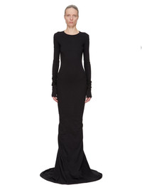 DRKSHDW FW25 CONCORDIANS SIMPLE EDFU GOWN IN DIRTY BLACK MEDIUM WEIGHT COTTON JERSEY THIS SIMPLE EDFU GOWN TRAILS FLOOR LENGTH AND HAS A CLOSE-TO-THE-BODY FIT WITH LONG SLEEVES. IT HAS A HIGH ROUND NECK AND LEVEL SHOULDER SEAM. IT FLARES INTO A FISHTAIL TRAIN WITH A GODET AT CENTRE BACK. THIS MEDIUMWEIGHT COTTON JERSEY HAS A COMPACT AND DRY HANDFEEL. THIS JERSEY IS GARMENT DYED THIS FABRIC IS MADE USING GOTS CERTIFIED ORGANIC COTTON WHICH MEANS THE NATURAL FIBER IS GROWN WITHOUT HARMFUL CHEMICALS, LEAVING OUR SOIL, AIR AND WATER CLEANER FROM CONTAMINATES COLOR: BLACK MATERIAL: 100% COTTON MODEL IS 181CM TALL MODEL WEARS SIZE XS
