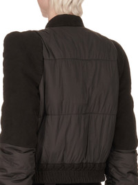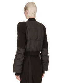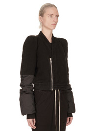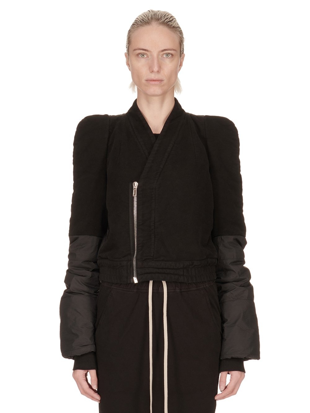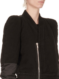 DRKSHDW FW24 PORTERVILLE METRO BOMBER IN BLACK COTTON MOLESKIN AND RECYCLED NYLON THIS METRO BOMBER IS ABOVE HIP LENGTH, WITH AN OFF-CENTRE ZIPPER, AND A SLIGHT V NECK. IT HAS ROUNDED METRO SHOULDERS, LONG SLEEVES WITH RIB CUFFS AND A RUCHED WAISTBAND WITH TOPSTITCHING.IT IS FULLY LINED AND HAS TWO INTERNAL POCKETS WITH SNAPS THIS MEDIUMWEIGHT COTTON MOLESKIN IS GARMENT DYED WITH A SOFT AND BRUSHED HANDFEEL THIS FABRIC IS MADE USING GOTS CERTIFIED ORGANIC COTTON WHICH MEANS THE NATURAL FIBER IS GROWN WITHOUT HARMFUL CHEMICALS, LEAVING OUR SOIL, AIR AND WATER CLEANER FROM CONTAMINATES - COLOR: BLACK - MATERIAL: FRONT AND UPPER SLEEVES 100% COTTON - BACK AND LOWER SLEEVES 100% NYLON - KNIT RIB CUFF 100% COTTON - FRONT LINING 100% COTTON - INSIDE POCKETS 100% COTTON - BACK AND SLEEVES LINING 100% NYLON - PADDING 90% POLYESTER - MODEL IS 181CM TALL - MODEL WEARS SIZE S