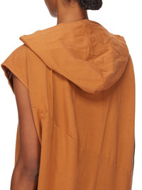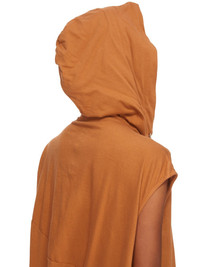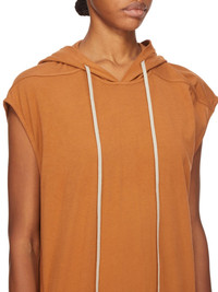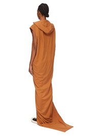 DRKSHDW SS25 HOLLYWOOD EDFU T DRESS IN ORANGE MEDIUM WEIGHT COTTON JERSEY THIS EDFU T DRESS IS LONG AND TRAILS FLOOR LENGTH, WITH A SQUARE LOOSE FIT. IT IS SLEEVELESS WITH WIDE SQUARE SHOULDERS AND LEVEL SHOULDER SEAMS. IT HAS A HOOD WITH A DRAWSTRING AND FEATURES A SKIRT THAT SLOPES FROM A SPLIT HIGH ON THE RIGHT THIGH, AND TAPERS INTO A LONG TRAIN THIS MEDIUMWEIGHT COTTON JERSEY HAS A COMPACT AND DRY HANDFEEL. THIS JERSEY IS GARMENT DYED THIS FABRIC IS MADE USING GOTS CERTIFIED ORGANIC COTTON WHICH MEANS THE NATURAL FIBER IS GROWN WITHOUT HARMFUL CHEMICALS, LEAVING OUR SOIL, AIR AND WATER CLEANER FROM CONTAMINATES COLOR: ORANGE MATERIAL: 100% COTTON MODEL IS 181CM TALL MODEL WEARS SIZE S