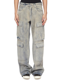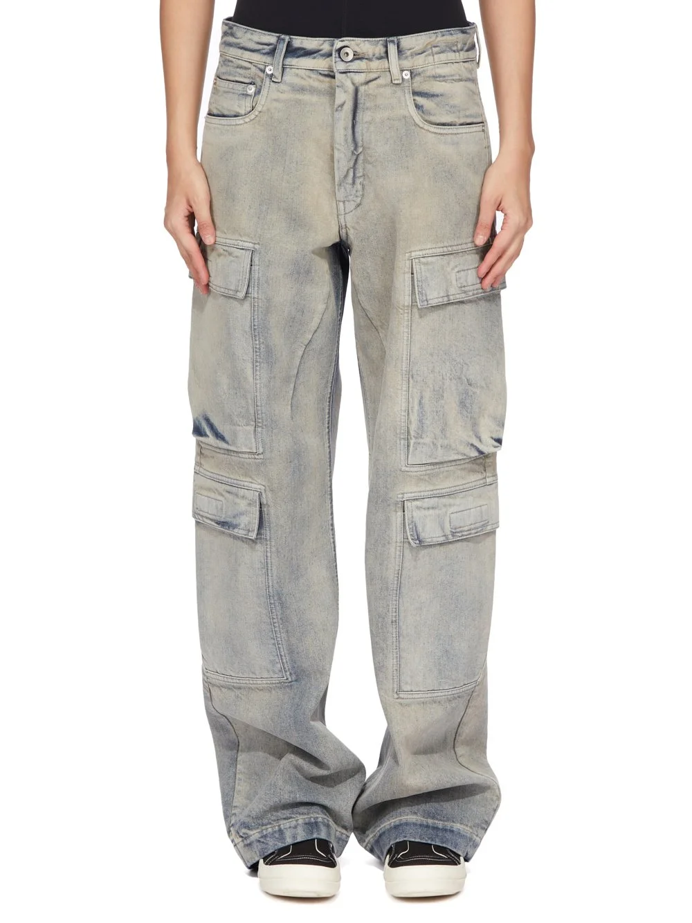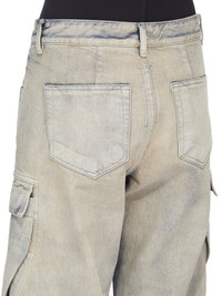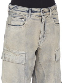 DRKSHDW FW25 CONCORDIANS DOUBLE CARGO JEANS IN 13OZ MINERAL PEARL DENIM THESE DOUBLE CARGO JEANS ARE A FULL LENGTH 5-POCKET JEAN WITH A LOW-RISE AND A LOOSE FIT. THEY HAVE A CONCEALED SILVER ZIP FLY, BELT LOOPS AND POCKET RIVETS AND THEY FEATURE TWO BEVELED CARGO POCKETS ON THE THIGH, WITH TWO SQUARE CARGO POCKETS BELOW AND TWO SQUARE BACK POCKETS. THEY ALL HAVE FLAPS AND TOPSTITCHING. THIS MEDIUMWEIGHT MINERAL PEARL DENIM IS MADE ON A 13OZ INDIGO AND NATURAL DENIM. THE READY GARMENT IS STONE WASHED TOGETHER WITH A MINERAL DYE THIS GARMENT IS TREATED IN AN ITALIAN WASH HOUSE BASED IN THE VENETO AREA OF ITALY, THAT PRODUCES IN SMALLER TREATMENT BATHS TO REDUCE WATER WASTE AND UTILIZE A WATER PURIFYING PROCESS THAT ENABLES THEM TO RECYCLE A PORTION OF THE WATER USED. ALL OF OUR DENIM WASHES ARE ZDHC CERTIFIED COLOR: MINERAL PEARL MATERIAL: 100% COTTON POCKETS LINING 52% POLYESTER + 48% COTTON MODEL IS 181CM TALL MODEL WEARS SIZE 26