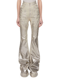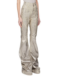 DRKSHDW FW25 CONCORDIANS BOLAN BOOTCUT IN PALLADIUM FOIL STRETCH DENIM THIS BOLAN BOOTCUT IS A HIGH WAISTED, SLIM FIT 6 POCKET JEAN WITH A FLOOR-LENGTH BOOT CUT. THEY HAVE A CONCEALED ZIPPER FLY WITH TOP BUTTON, A WAISTBAND WITH POCKET RIVETS AND REAR PATCH POCKETS WITH TOPSTITCHING. THEY FEATURE CREASED WHISKERING AT THE CROTCH. THIS LIGHTWEIGHT STRETCH DENIM IS OVERDYED AND TREATED WITH A PALLADIUM FOIL OVERLAY AND WASHED TO ACHIEVE THE IRREGULAR LOOK SINCE THE FOIL IS PRESSED ON TOP OF THE FINAL GARMENTS, EACH PIECE WILL HAVE ITS OWN UNIQUE LOOK AND CREASES SINCE THE FOIL WILL ATTACH TO DIFFERENT PLACES DEPENDING ON THE GARMENT THIS GARMENT IS TREATED IN AN ITALIAN WASH HOUSE BASED IN THE VENETO AREA OF ITALY, THAT PRODUCES IN SMALLER TREATMENT BATHS TO REDUCE WATER WASTE AND UTILIZE A WATER PURIFYING PROCESS THAT ENABLES THEM TO RECYCLE A PORTION OF THE WATER USED. ALL OF OUR DENIM WASHES ARE ZDHC CERTIFIED COLOR: PALLADIUM MATERIAL: 90% COTTON + 7% POLYESTER + 3% RUBBER FIBER MODEL IS 181CM TALL MODEL WEARS SIZE 26
