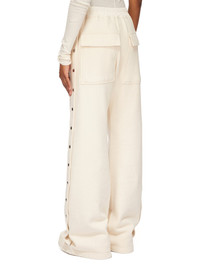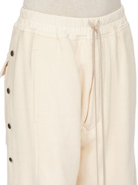 DRKSHDW SS25 HOLLYWOOD PUSHER PANTS IN NATURAL FURKA HEAVY SWEATSHIRT THESE PUSHER PANTS ARE FLOOR LENGTH WITH A WIDE LEG AND A SLIGHTLY DROPPED CROTCH. THEY HAVE AN ELASTICIZED WAISTBAND WITH DRAWSTRING, SIDE FRONT JET POCKETS AND SQUARE BACK POCKETS WITH TOPSTITCHING. THEY FEATURE VISIBLE SNAP CLOSURES RUNNING DOWN THE OUTER LEG, ALLOWING THEM TO BE UNSNAPPED AND WORN OPEN THIS HEAVYWEIGHT COTTON SWEATSHIRT JERSEY HAS A SOFT AND WASHED HANDFEEL. THE COLOR OF THIS JERSEY IS NATURAL WITH VISIBLE SLUBS AND IMPURITIES NATURAL TO THE COTTON FIBRE. THIS JERSEY IS GARMENT WASHED. THIS FABRIC IS MADE USING GOTS CERTIFIED ORGANIC COTTON WHICH MEANS THE NATURAL FIBER IS GROWN WITHOUT HARMFUL CHEMICALS, LEAVING OUR SOIL, AIR AND WATER CLEANER FROM CONTAMINATES COLOR: NATURAL MATERIAL: 100% COTTON BAND 97% COTTON + 3% ELASTANE MODEL IS 181CM TALL MODEL WEARS SIZE S