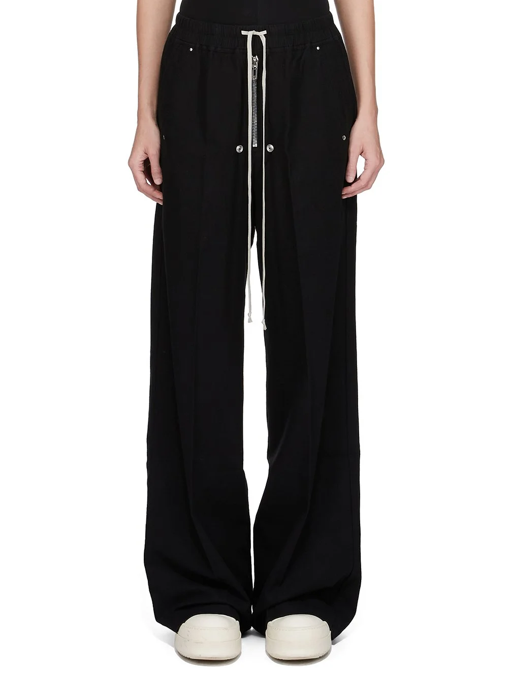 DRKSHDW FW25 CONCORDIANS GETH BELAS IN BLACK LIGHT FLANNEL THESE GETH BELA PANTS ARE FULL-LENGTH WITH A LOW CROTCH AND WIDE LEG. THEY FEATURE AN ELASTICIZED WAISTBAND WITH VERTICAL STITCHING AND DRAWSTRING AND A BELA EXPOSED CENTER ZIPPER WITH TWO SNAP DETAIL AT BOTTOM. THEY HAVE SIDE POCKETS WITH EYELET AND RIVET DETAIL AND BACK POCKETS WITH FLAPS AND VISIBLE SNAP CLOSURES. THIS LIGHTWEIGHT COTTON FLANNEL FABRIC IS GARMENT DYED WITH A SOFT AND BRUSHED HANDFEEL THIS FABRIC IS MADE USING GOTS CERTIFIED ORGANIC COTTON WHICH MEANS THE NATURAL FIBER IS GROWN WITHOUT HARMFUL CHEMICALS, LEAVING OUR SOIL, AIR AND WATER CLEANER FROM CONTAMINATES COLOR: BLACK MATERIAL: 100% COTTON MODEL IS 181CM TALL MODEL WEARS SIZE S