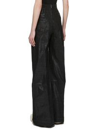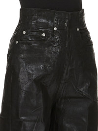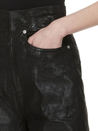 DRKSHDW SS25 HOLLYWOOD DIRT COOPER IN BLACK OVERDYED FOIL STRETCH DENIM THESE DIRT COOPER TROUSERS ARE FULL LENGTH WITH A WIDE FIT AND A REGULAR CROTCH. THEY ARE A 5 POCKET JEAN WITH RIVETS, REAR PATCH POCKETS AND TOPSTITCHINGTHEY FEATURE AN EXTRA HIGH DIRT WAIST THAT CLOSES WITH A CENTRE BACK ZIPPER THIS LIGHTWEIGHT FOIL DENIM IS MADE ON A 10OZ STRETCH DENIM. THE READY GARMENT IS OVERDYED AND HAS A CLEAR, SEMI SHINY FOIL OVERLAY THAT CREATES A WAXY TOUCH SINCE THE FOIL IS PRESSED ON TOP OF THE FINAL GARMENTS, EACH PIECE WILL HAVE ITS OWN UNIQUE LOOK AND CREASES SINCE THE FOIL WILL ATTACH TO DIFFERENT PLACES DEPENDING ON THE GARMENT THIS GARMENT IS TREATED IN AN ITALIAN WASH HOUSE BASED IN THE VENETO AREA OF ITALY, THAT PRODUCES IN SMALLER TREATMENT BATHS TO REDUCE WATER WASTE AND UTILIZE A WATER PURIFYING PROCESS THAT ENABLES THEM TO RECYCLE A PORTION OF THE WATER USED. ALL OF OUR DENIM WASHES ARE ZDHC CERTIFIED. COLOR: BLACK MATERIAL: 90% COTTON + 7% POLYESTER + 3% RUBBER POCKETS LINING 100% COTTON MODEL IS 181CM TALL MODEL WEARS SIZE 26