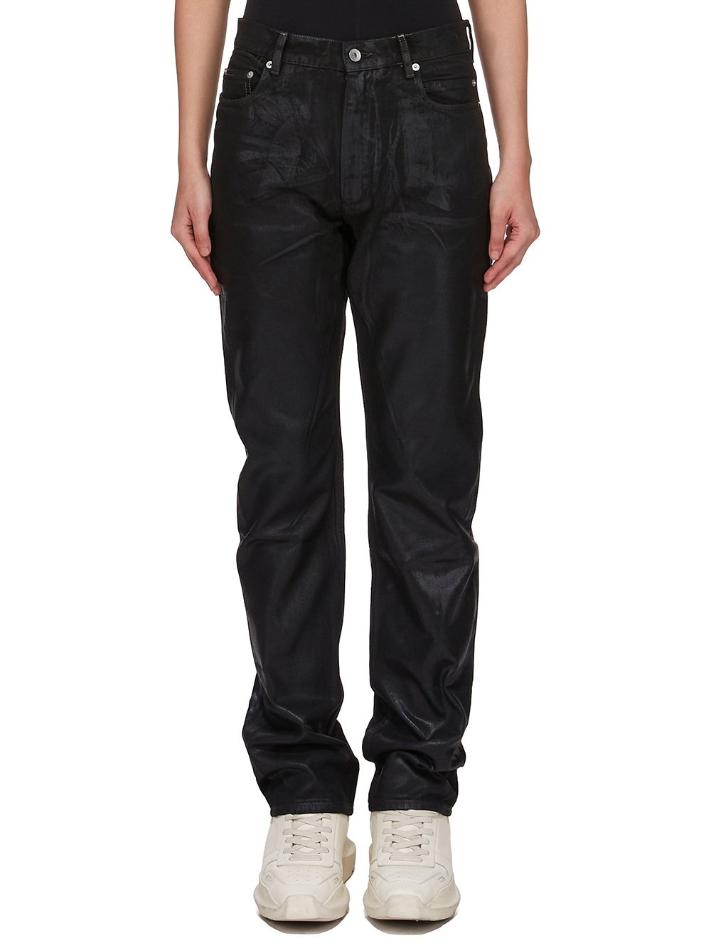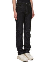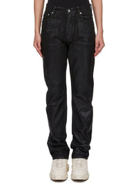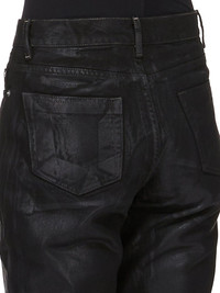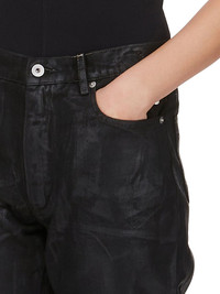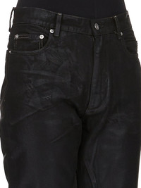 DRKSHDW SS25 HOLLYWOOD GRANBURY JEANS IN BLACK 13OZ WASHED INDIGO DENIM THESE GRANBURY JEANS ARE A FULL LENGTH, HIGH-WAISTED, 6 POCKET JEAN. THEY HAVE A CONCEALED SILVER ZIP FLY WITH TOP BUTTON. THEY FEATURE CROTCH AND KNEE WHISKERING THIS MEDIUMWEIGHT FOIL DENIM IS OVERDYED AND HAS A CLEAR, SEMI SHINY FOIL OVERLAY THAT CREATES A WAXY TOUCH SINCE THE FOIL IS PRESSED ON TOP OF THE FINAL GARMENTS, EACH PIECE WILL HAVE ITS OWN UNIQUE LOOK AND CREASES SINCE THE FOIL WILL ATTACH TO DIFFERENT PLACES DEPENDING ON THE GARMENT THIS FABRIC IS MADE USING GOTS CERTIFIED ORGANIC COTTON WHICH MEANS THE NATURAL FIBER IS GROWN WITHOUT HARMFUL CHEMICALS, LEAVING OUR SOIL, AIR AND WATER CLEANER FROM CONTAMINATES THIS GARMENT IS TREATED IN AN ITALIAN WASH HOUSE BASED IN THE VENETO AREA OF ITALY, THAT PRODUCES IN SMALLER TREATMENT BATHS TO REDUCE WATER WASTE AND UTILIZE A WATER PURIFYING PROCESS THAT ENABLES THEM TO RECYCLE A PORTION OF THE WATER USED. ALL OF OUR DENIM WASHES ARE ZDHC CERTIFIED COLOR: BLACK MATERIAL: 100% COTTON POCKETS LINING 52% POLYESTER + 48% COTTON MODEL IS 181CM TALL MODEL WEARS SIZE 26