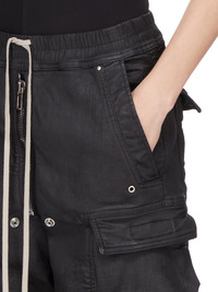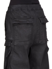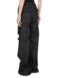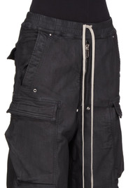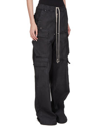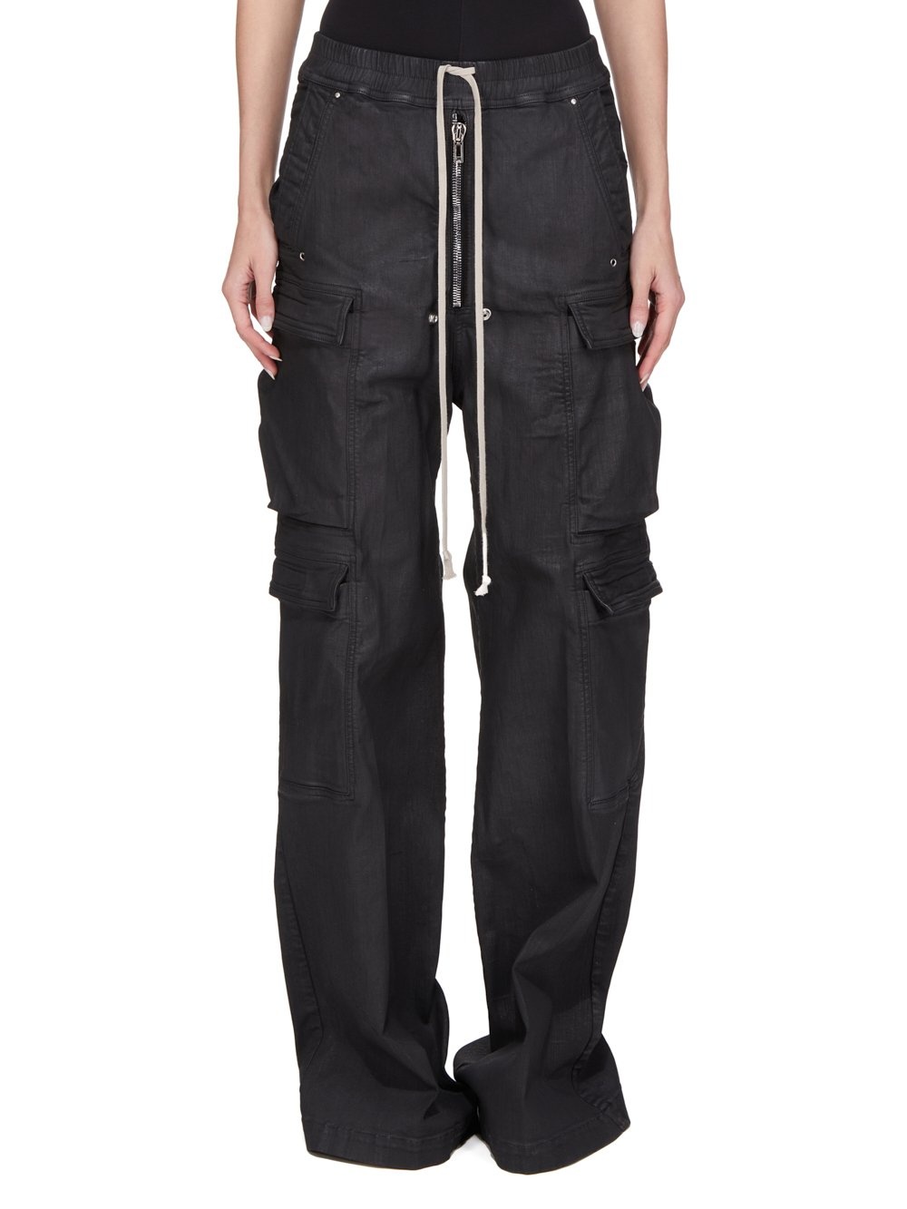 DRKSHDW SS25 HOLLYWOOD DOUBLE CARGO JUMBO BELAS IN BLACK WAX BLACK WAX STRETCH DENIM THESE DOUBLE CARGO JUMBO BELA PANTS ARE FULL-LENGTH WITH A LOW CROTCH AND WIDE LEG. THEY FEATURE AN ELASTICIZED WAISTBAND WITH DRAWSTRING AND A BELA EXPOSED CENTER ZIPPER WITH TWO SNAP DETAIL AND SIDE WELT POCKETS WITH RIVETS. THEY FEATURE TWO BEVELED CARGO POCKETS ON THE THIGH, WITH TWO SQUARE CARGO POCKETS BELOW, AND TWO SQUARE BACK POCKETS, ALL HAVE FLAPS AND TOPSTITCHING THIS LIGHTWEIGHT BLACK WAX DENIM IS MADE ON A 10OZ BLACK AND NATURAL STRETCH DENIM. THE READY GARMENT IS OVERDYED BLACK AND TREATED WITH A WAX FINISH. A FINAL WASH GIVES THIS GARMENT ITS SOFTNESS. THIS GARMENT IS TREATED IN AN ITALIAN WASH HOUSE BASED IN THE VENETO AREA OF ITALY, THAT PRODUCES IN SMALLER TREATMENT BATHS TO REDUCE WATER WASTE AND UTILIZE A WATER PURIFYING PROCESS THAT ENABLES THEM TO RECYCLE A PORTION OF THE WATER USED. ALL OF OUR DENIM WASHES ARE ZDHC CERTIFIED COLOR: BLACK WAX MATERIAL: 91% COTTON + 6% ELASTOMULTIESTER + 3% RUBBER POCKETS LINING 100% COTTON MODEL IS 181CM TALL MODEL WEARS SIZE S