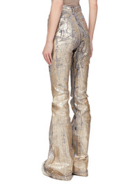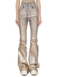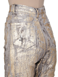 DRKSHDW SS25 HOLLYWOOD BOLAN BOOTCUT IN GOLD GOLD MEGACRUST STRETCH DENIM THIS BOLAN BOOTCUT IS A HIGH WAISTED, SLIM FIT 6 POCKET JEAN WITH A FLOOR-LENGTH BOOT CUT. THEY HAVE A CONCEALED ZIPPER FLY WITH TOP BUTTON, A WAISTBAND WITH POCKET RIVETS AND REAR PATCH POCKETS WITH TOPSTITCHING. THEY FEATURE CREASED WHISKERING AT THE CROTCH THIS LIGHTWEIGHT GOLD MEGACRUST DENIM IS MADE ON A 10OZ BLACK AND NATURAL STRETCH DENIM. THE READY GARMENT IS OVERDYED DUST AND THEN TREATED WITH LAYERS OF GOLD COLORED FOIL THAT IS PRESSED ON BY HAND. THE NATURAL ASPECTS OF THIS TREATMENT MEANS THE FOIL APPLICATION IS IRREGULAR AND HAS PEELED OFF AND CRACKED IN CERTAIN AREAS AND WILL CONTINUE TO DO SO WITH WEAR AND ABRASION. THIS IS AN INHERENT CHARACTERISTIC OF THIS TYPE OF TREATMENT AND IS A DESIRED A VISUAL ASPECT WHICH ADDS TO THE UNIQUENESS OF EACH PIECE. THIS GARMENT IS TREATED IN AN ITALIAN WASH HOUSE BASED IN THE VENETO AREA OF ITALY, THAT PRODUCES IN SMALLER TREATMENT BATHS TO REDUCE WATER WASTE AND UTILIZE A WATER PURIFYING PROCESS THAT ENABLES THEM TO RECYCLE A PORTION OF THE WATER USED. ALL OF OUR DENIM WASHES ARE ZDHC CERTIFIED COLOR: GOLD MATERIAL: 91% COTTON + 6% ELASTOMULTIESTER + 3% RUBBER POCKETS LINING 100% COTTON MODEL IS 181CM TALL MODEL WEARS SIZE 26