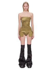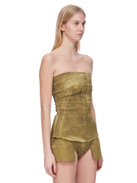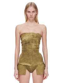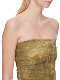 DRKSHDW FW24 PORTERVILLE BUSTIER TOP IN SAGE FOIL STRETCH DENIM THIS BUSTIER TOP IS HIP LENGTH WITH A CLOSE TO THE BODY FIT. ITS STRAPLESS BUSTIER TOP HAS A SIGNATURE SPLINTERED MOTIVO, WITH SEAM LINES DESCENDING FROM THE NECKLINE TO A BLUNT POINT BELOW THE BUST, AND ACROSS THE CHEST, SLOPING DOWN THE SIDE BODY WRAPPING TO THE HEM. IT HAS A CENTRE BACK ZIPPER AND RAW CUT HEM THIS LIGHTWEIGHT STRETCH DENIM IS OVERDYED WITH A CLEAR FOIL OVERLAY THAT CREATES THE WAXY TOUCH SINCE THE FOIL IS PRESSED ON TOP OF THE FINAL GARMENTS, EACH PIECE WILL HAVE ITS OWN UNIQUE LOOK AND CREASES SINCE THE FOIL WILL ATTACH TO DIFFERENT PLACES DEPENDING ON THE GARMENT. THIS GARMENT IS TREATED IN AN ITALIAN WASH HOUSE BASED IN THE VENETO AREA OF ITALY, THAT PRODUCES IN SMALLER TREATMENT BATHS TO REDUCE WATER WASTE AND UTILIZE A WATER PURIFYING PROCESS THAT ENABLES THEM TO RECYCLE A PORTION OF THE WATER USED. ALL OF OUR DENIM WASHES ARE ZDHC CERTIFIED - COLOR: SAGE - MATERIAL: 85% COTTON + 10% POLYESTER + 5% ELASTANE - INNER BUSTIER 84% NYLON + 16% ELASTANE - MODEL IS 181CM TALL - MODEL WEARS SIZE S