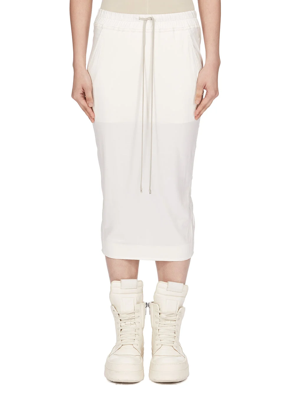 DRKSHDW SS26 TEMPLE PULL ON PILLAR SKIRT KNEE IN CREAM LIQUID JERSEY THIS PULL ON PILLAR KNEE SKIRT IS KNEE LENGTH AT FRONT AND OPEN AT THE REAR. IT HAS AN ELASTICIZED WAISTBAND WITH DRAWSTRING AND TWO SIDE FRONT POCKETS. THE SKIRT WRAPS TO THE BACK, CREATING A CENTRE BACK SPLIT OPENING AND DRAPING EFFECT. THIS LIGHTWEIGHT AND FLUID ACETATE JERSEY HAS A COOL AND SOFT HANDFEEL. A FINAL CINZ HEAT PRESS TREATMENT GIVES THIS JERSEY ITS SHINE. COLOR: CREAM MATERIAL:80% ACETATE + 20% NYLON MODEL IS 181CM TALL MODEL WEARS SIZE S