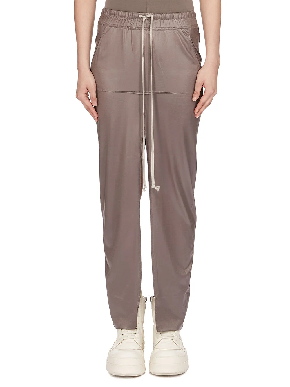 DRKSHDW SS26 TEMPLE PULL ON SLICED PILLAR SKIRT IN DUST LIQUID JERSEY THIS PULL ON SLICED PILLAR SKIRT IS ANKLE LENGTH AT SIDES. IT HAS AN ELASTICIZED WAIST AND DRAWSTRING AND A CLOSE TO THE BODY FIT. IT FEATURES TWO HIGH SLITS FRONT AND BACK WITH RAW CUT EDGES, AS WELL AS A FRONT AND BACK RIDGE STITCH DETAIL. IT HAS SIDE SEAM POCKETS. THIS LIGHTWEIGHT AND FLUID ACETATE JERSEY HAS A COOL AND SOFT HANDFEEL. A FINAL CINZ HEAT PRESS TREATMENT GIVES THIS JERSEY ITS SHINE. COLOR: DUST MATERIAL: 80% ACETATE + 20% NYLON MODEL IS 181CM TALL MODEL WEARS SIZE S