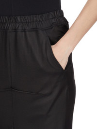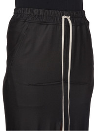 DRKSHDW SS26 TEMPLE PULL ON SLICED PILLAR SKIRT IN BLACK LIQUID JERSEY THIS PULL ON SLICED PILLAR SKIRT IS ANKLE LENGTH AT SIDES. IT HAS AN ELASTICIZED WAIST AND DRAWSTRING AND A CLOSE TO THE BODY FIT. IT FEATURES TWO HIGH SLITS FRONT AND BACK WITH RAW CUT EDGES, AS WELL AS A FRONT AND BACK RIDGE STITCH DETAIL. IT HAS SIDE SEAM POCKETS. THIS LIGHTWEIGHT AND FLUID ACETATE JERSEY HAS A COOL AND SOFT HANDFEEL. A FINAL CINZ HEAT PRESS TREATMENT GIVES THIS JERSEY ITS SHINE. COLOR: BLACK MATERIAL:80% ACETATE + 20% NYLON MODEL IS 181CM TALL MODEL WEARS SIZE S