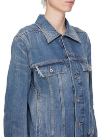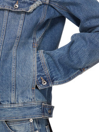 DRKSHDW SS25 HOLLYWOOD TRUCKER IN WASHED INDIGO 13OZ WASHED INDIGO DENIM THIS TRUCKER JKT IS ABOVE HIP LENGTH. IT HAS A CENTRE FRONT PLACKET WITH VISIBLE BUTTON CLOSURES, A CLASSIC COLLAR, TWO CHEST POCKETS WITH FRAYED OUTER FLAP EDGES AND BUTTONS AND SIDE SEAM POCKETS. IT HAS LONG SLEEVES WITH BUTTONED CUFFS, SIGNATURE LEVEL SHOULDER SEAMS, A FRONT AND BACK YOKE AND VERTICAL SEAMED PANELS WITH DOUBLE TOP STITCHING THIS MEDIUMWEIGHT WASHED INDIGO DENIM IS MADE ON A 13OZ INDIGO AND NATURAL JAPANESE SELVEDGE DENIM. THE READY GARMENT IS WASHED WITH MINERALS TO ACHIEVE THE FINAL LOOK. THIS GARMENT IS TREATED IN AN ITALIAN WASH HOUSE BASED IN THE VENETO AREA OF ITALY, THAT PRODUCES IN SMALLER TREATMENT BATHS TO REDUCE WATER WASTE AND UTILIZE A WATER PURIFYING PROCESS THAT ENABLES THEM TO RECYCLE A PORTION OF THE WATER USED. ALL OF OUR DENIM WASHES ARE ZDHC CERTIFIED COLOR: WASHED INDIGO MATERIAL: 100% COTTON POCKETS LINING 52% POLYESTER + 48% COTTON MODEL IS 181CM TALL MODEL WEARS SIZE M