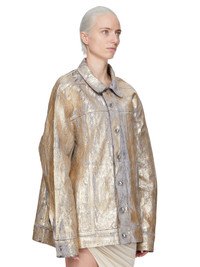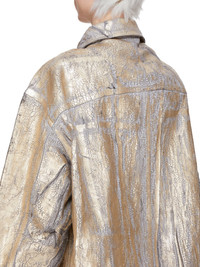 DRKSHDW SS25 HOLLYWOOD JUMBO WORKER GOLD MEGACRUST STRETCH DENIM THIS JUMBO WORKER JACKET IS HIP LENGTH AND OVERSIZED WITH LONG SLEEVES. IT FEATURES A CENTRE FRONT PLACKET WITH VISIBLE BUTTONS, A CLASSIC COLLAR AND BUTTONED CUFFS. IT HAS A FRONT AND BACK YOKE, VERTICAL SEAMED PANELS, SIDE FRONT POCKETS, A WAISTBAND HEM WITH BUTTON DETAIL AND DOUBLE TOP STITCHING ON ALL SEAMS. IT IS UNLINED AND HAS TWO INTERNAL POCKETS THIS LIGHTWEIGHT GOLD MEGACRUST DENIM IS MADE ON A 10OZ BLACK AND NATURAL STRETCH DENIM. THE READY GARMENT IS OVERDYED DUST AND THEN TREATED WITH LAYERS OF GOLD COLORED FOIL THAT IS PRESSED ON BY HAND. THE NATURAL ASPECTS OF THIS TREATMENT MEANS THE FOIL APPLICATION IS IRREGULAR AND HAS PEELED OFF AND CRACKED IN CERTAIN AREAS AND WILL CONTINUE TO DO SO WITH WEAR AND ABRASION. THIS IS AN INHERENT CHARACTERISTIC OF THIS TYPE OF TREATMENT AND IS A DESIRED A VISUAL ASPECT WHICH ADDS TO THE UNIQUENESS OF EACH PIECE. THIS GARMENT IS TREATED IN AN ITALIAN WASH HOUSE BASED IN THE VENETO AREA OF ITALY, THAT PRODUCES IN SMALLER TREATMENT BATHS TO REDUCE WATER WASTE AND UTILIZE A WATER PURIFYING PROCESS THAT ENABLES THEM TO RECYCLE A PORTION OF THE WATER USED. ALL OF OUR DENIM WASHES ARE ZDHC CERTIFIED COLOR: GOLD MATERIAL: 91% COTTON + 6% ELASTOMULTIESTER + 3% RUBBER POCKETS LINING 100% COTTON MODEL IS 181CM TALL MODEL WEARS SIZE S