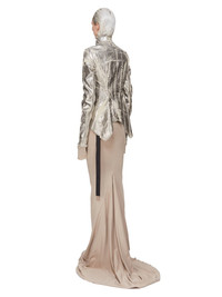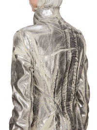 DRKSHDW FW25 CONCORDIANS NASKA GARY JKT IN PALLADIUM FOIL STRETCH DENIM THIS NASKA GARY JACKET IS BELOW WAIST LENGTH WITH A SKIN TIGHT FIT. IT HAS LONG SLEEVES, A HIGH NECK WITH AN ASYMMETRICAL ZIP FRONT OPENING AND LEVEL SHOULDER SEAMS WITH TOPSTITCHING. IT FEATURES A CURVED NASKA HEMLINE THAT DIPS INTO TWO POINTS AT THE BACK AND HAS RAW CUT HEMS AND EDGES. THIS LIGHTWEIGHT STRETCH DENIM IS OVERDYED AND TREATED WITH A PALLADIUM FOIL OVERLAY AND WASHED TO ACHIEVE THE IRREGULAR LOOK SINCE THE FOIL IS PRESSED ON TOP OF THE FINAL GARMENTS, EACH PIECE WILL HAVE ITS OWN UNIQUE LOOK AND CREASES SINCE THE FOIL WILL ATTACH TO DIFFERENT PLACES DEPENDING ON THE GARMENT THIS GARMENT IS TREATED IN AN ITALIAN WASH HOUSE BASED IN THE VENETO AREA OF ITALY, THAT PRODUCES IN SMALLER TREATMENT BATHS TO REDUCE WATER WASTE AND UTILIZE A WATER PURIFYING PROCESS THAT ENABLES THEM TO RECYCLE A PORTION OF THE WATER USED. ALL OF OUR DENIM WASHES ARE ZDHC CERTIFIED COLOR: PALLADIUM MATERIAL: 90% COTTON + 7% POLYESTER + 3% RUBBER FIBER MODEL IS 181CM TALL MODEL WEARS SIZE S