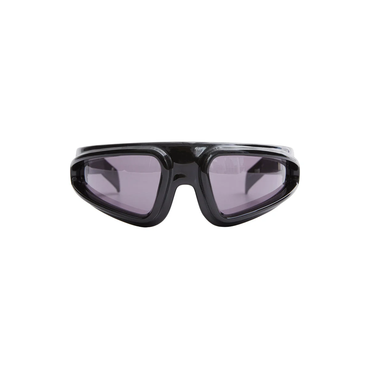 These Ryder sunglasses are a pair of wrap-around frames with a bold straight eyebrow ridge, it features deep set lenses edged with a thick protruding frame and label's signature thick angled arms adorned with Rick Owens logo on it.