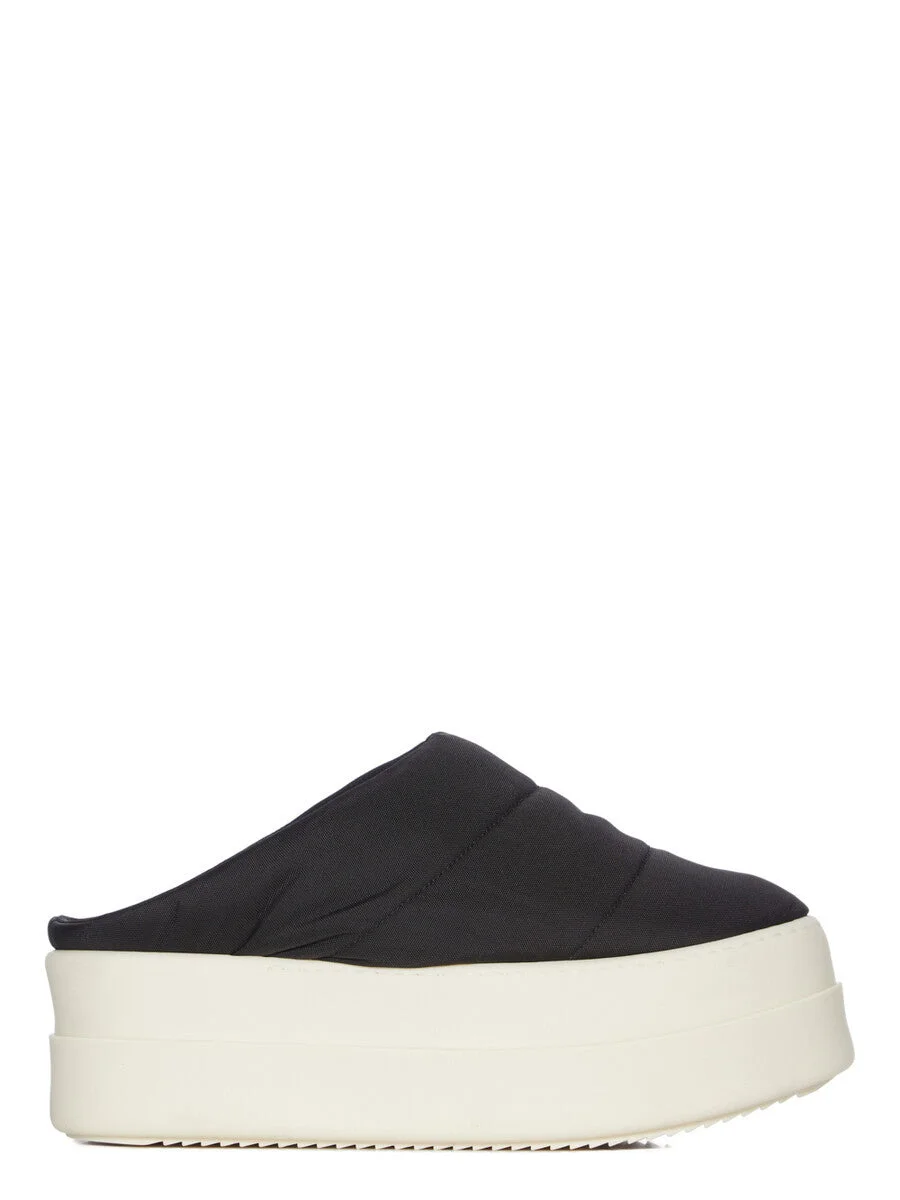 DRKSHDW FW25 CONCORDIANS MEGA BUMPER SLIP ON LUNAR IN BLACK/MILK NYLON CANVAS THESE MEGA BUMPER SLIP ON LUNAR ARE MULE-LIKE. THEY HAVE A SOFT PADDED UPPER WITH QUILTED STITCHED PANELS. AND FEATURE DOUBLE HEIGHT, SHARK-TOOTHED MEGA BUMPER SOLES. THIS MEDIUMWEIGHT NYLON CANVAS IS COMPACT WITH A SOFT AND TECHNICAL HANDFEEL. THIS FABRIC IS MADE USING GRS CERTIFIED RECYCLED NYLON WHICH ENSURES A REDUCTION IN WATER CONSUMPTION, EMISSIONS AND HAZARDOUS WASTE, LESSENING THE DEPENDENCE ON NON-RENEWABLE RESOURCES. COLOR: BLACK/MILK MATERIAL: UPPER 100% NYLON LINING 100% NYLON PADDING 70% POLYURETHANE + 30% POLYESTER SOLE HEIGHT 6.5CM
