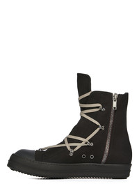 DRKSHDW SS25 HOLLYWOOD HEXA SNEAKS IN BLACK/PEARL/BLACK/BLACK 13OZ OVERDYED DENIM THESE HEXA SNEAKS ARE ABOVE ANKLE HEIGHT AND FEATURE HOOKS WITH HEXA FRONT LACES THAT CRISS-CROSS THE FOOT, AND WRAP AROUND THE ANKLE. THEY HAVE A ZIPPER ON THE INSIDE ANKLE FOR EASY FASTENING, TOE CAPS AND SHARK-TOOTH SOLES THIS MEDIUMWEIGHT 13OZ DENIM IS OVERDYED AND HAS A SOFT AND WASHED HANDFEEL. THIS FABRIC IS MADE USING GOTS CERTIFIED ORGANIC COTTON WHICH MEANS THE NATURAL FIBER IS GROWN WITHOUT HARMFUL CHEMICALS, LEAVing OUR SOIL, AIR AND WATER CLEANER FROM CONTAMINATES COLOR: BLACK/PEARL/BLACK/BLACK MATERIAL: UPPER 100% COTTON TOE 70% POLYURETHANE + 30% VISCOSE LINING 100% COTTON SOLE 100% THERMOPLASTIC RUBBER SOLE HEIGHT 3.5CM