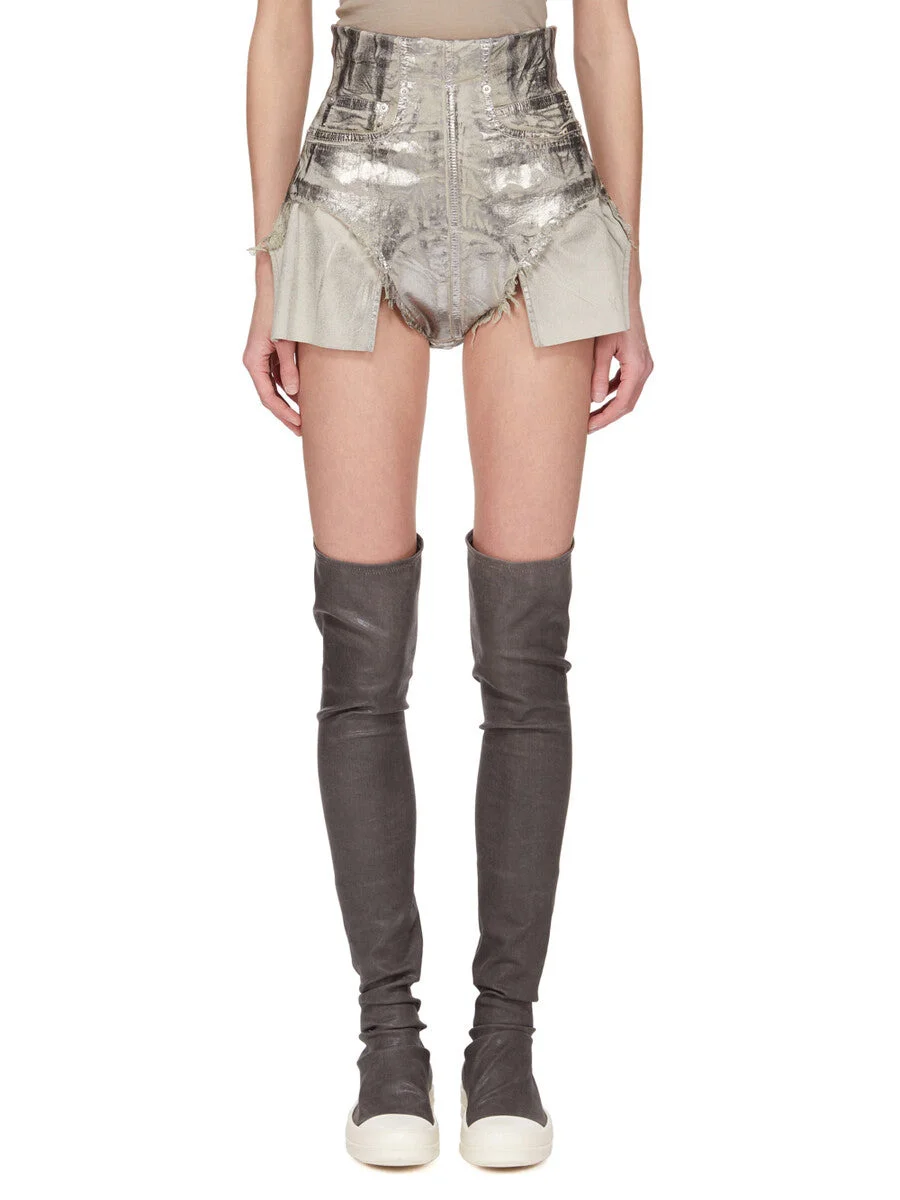 DRKSHDW FW25 CONCORDIANS DIRT CUTOFFS IN PALLADIUM FOIL STRETCH DENIM THESE DIRT CUTOFFS ARE CUT HIGH ON THE HIP WITH A TIGHT FIT. THEY HAVE AN EXTRA HIGH WAIST, FRONT JEAN POCKETS WITH RIVETS, BACK JET POCKETS AND POCKET BAG LININGS WHICH HANG BELOW THE RAW CUT HEMS, FRONT AND BACK. THEY HAVE DOUBLE TOPSTITCHED DENIM SEAMS AND OPEN WITH A CENTRE BACK ZIPPER. THIS LIGHTWEIGHT STRETCH DENIM IS OVERDYED AND TREATED WITH A PALLADIUM FOIL OVERLAY AND WASHED TO ACHIEVE THE IRREGULAR LOOK. SINCE THE FOIL IS PRESSED ON TOP OF THE FINAL GARMENTS, EACH PIECE WILL HAVE ITS OWN UNIQUE LOOK AND CREASES SINCE THE FOIL WILL ATTACH TO DIFFERENT PLACES DEPENDING ON THE GARMENT. THIS GARMENT IS TREATED IN AN ITALIAN WASH HOUSE BASED IN THE VENETO AREA OF ITALY, THAT PRODUCES IN SMALLER TREATMENT BATHS TO REDUCE WATER WASTE AND UTILIZE A WATER PURIFYING PROCESS THAT ENABLES THEM TO RECYCLE A PORTION OF THE WATER USED. ALL OF OUR DENIM WASHES ARE ZDHC CERTIFIED. COLOR: PALLADIUM MATERIAL: 90% COTTON + 7% POLYESTER + 3% RUBBER FIBER MODEL IS 181CM TALL MODEL WEARS SIZE S