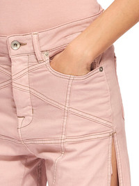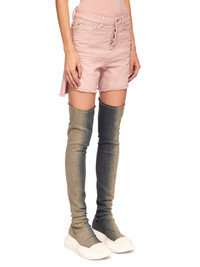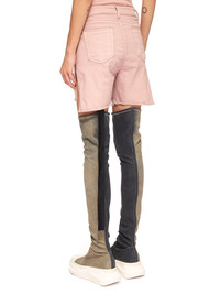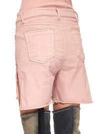 RICK OWENS SS23 EDFU TRUCKER CUT OFFS IN OVERDYED STRETCH DENIM THESE TRUCKER CUT OFFS ARE MID-THIGH KNEE LENGTH 5 POCKET JEAN SHORTS. THEY HAVE A BUTTON FLY, A WAISTBAND WITH BELT LOOPS, POCKET RIVETS, REAR PATCH POCKETS AND TOPSTITCHING. THEY FEATURE SIDE SEAM SPLITS AND RAW CUT HEMS. THIS VERSION FEATURES A SIGNATURE PENTAGRAM PATCHWORK WITH TOPSTITCHED SEAMS ON THE FRONT THIS LIGHTWEIGHT STRETCH DENIM IS OVERDYED AND HAS A WASHED HANDFEEL - COLOR: FADED PINK - MATERIAL: 90% COTTON + 7% POLYESTER + 3% RUBBER - POCKETS LINING 100% COTTON - MODEL IS WEARING SIZE S - MODEL IS 181 CM TALL