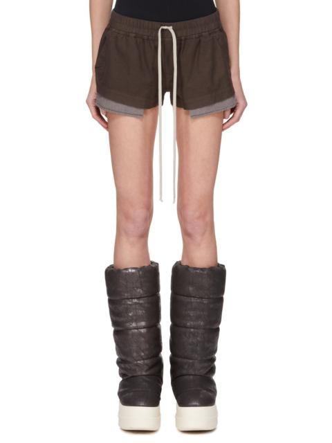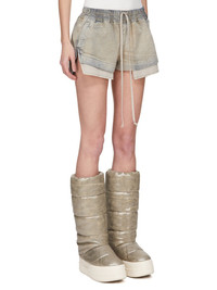 DRKSHDW FW25 CONCORDIANS FOG BOXERS IN 13OZ MINERAL PEARL DENIM THESE FOG BOXERS ARE CUT HIGH ON THE THIGH. THEY HAVE AN ELASTICIZED WAISTBAND WITH DRAWSTRING, SIDE WELT POCKETS AND SIDE SLITS. THIS MEDIUMWEIGHT MINERAL PEARL DENIM IS MADE ON A 13OZ INDIGO AND NATURAL DENIM. THE READY GARMENT IS STONE WASHED TOGETHER WITH A MINERAL DYE THIS GARMENT IS TREATED IN AN ITALIAN WASH HOUSE BASED IN THE VENETO AREA OF ITALY, THAT PRODUCES IN SMALLER TREATMENT BATHS TO REDUCE WATER WASTE AND UTILIZE A WATER PURIFYING PROCESS THAT ENABLES THEM TO RECYCLE A PORTION OF THE WATER USED. ALL OF OUR DENIM WASHES ARE ZDHC CERTIFIED COLOR: MINERAL PEARL MATERIAL: 100% COTTON BAND 91% COTTON + 6% ELASTOMULTIESTER + 3% RUBBER FIBER POCKETS LINING 52% POLYESTER + 48% COTTON MODEL IS 181CM TALL MODEL WEARS SIZE S