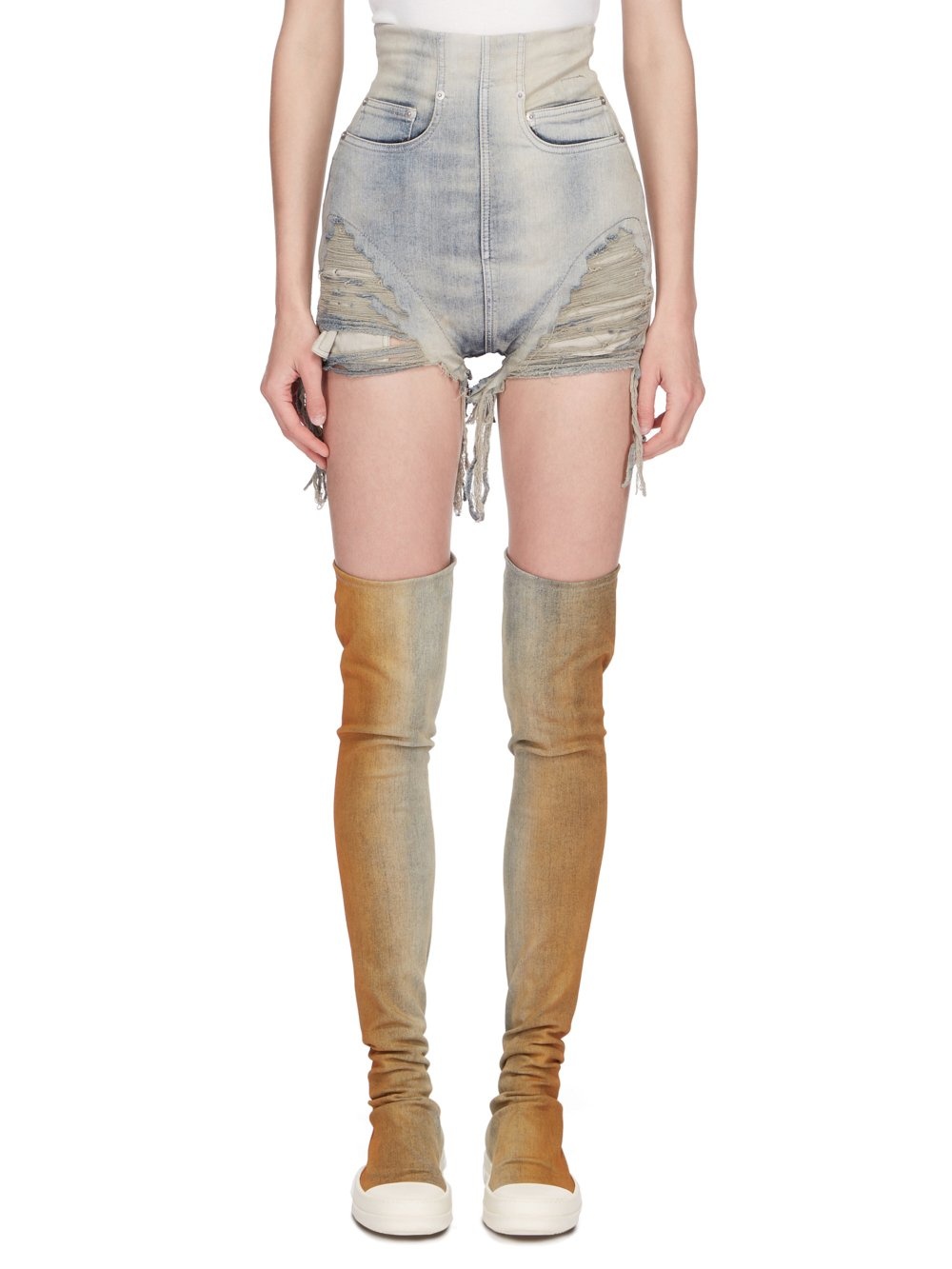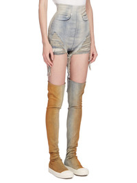 DRKSHDW SS24 LIDO DIRT CUTOFFS IN SKY SKY STRETCH DENIM THESE DIRT CUTOFFS ARE CUT HIGH ON THE HIP WITH A TIGHT FIT. THEY HAVE AN EXTRA HIGH WAIST, FRONT JEAN POCKETS WITH RIVETS, BACK JET POCKETS AND POCKET BAG LININGS WHICH HANG BELOW THE RAW CUT HEMS, FRONT AND BACK. THEY HAVE DOUBLE TOPSTITCHED DENIM SEAMS, AND OPEN WITH A CENTRE BACK ZIPPER. THIS VERSION HAS A SHREDDED FRINGE FRONT AND BACK THIS LIGHTWEIGHT INDIGO STRETCH DENIM IS STONE WASHED AND THEN OVERDYED WITH MINERALS TO CREATE THE SKY COLORATION THE FRAYED EDGES ARE ACHIEVED BY A COMBINATION OF A LASER TREATMENT AND THE HANDWORK OF AN ARTISAN. THIS GARMENT IS TREATED IN AN ITALIAN WASH HOUSE BASED IN THE VENETO AREA OF ITALY, THAT PRODUCES IN SMALLER TREATMENT BATHS TO REDUCE WATER WASTE AND UTILIZE A WATER PURIFYING PROCESS THAT ENABLES THEM TO RECYCLE A PORTION OF THE WATER USED. ALL OF OUR DENIM WASHES ARE ZDHC CERTIFIED - COLOR: SKY - MATERIAL: 91% COTTON + 6% ELASTOMULTIESTER + 3% RUBBER - POCKETS LINING 52% POLYESTER + 48% COTTON - MODEL IS 181CM TALL - MODEL WEARS SIZE S