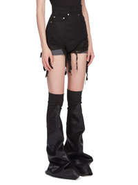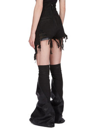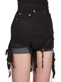 DRKSHDW SS24 LIDO DIRT CUTOFFS IN BLACK BLACKETY BLACK STRETCH DENIM THESE DIRT CUTOFFS ARE CUT HIGH ON THE HIP WITH A TIGHT FIT. THEY HAVE AN EXTRA HIGH WAIST, FRONT JEAN POCKETS WITH RIVETS, BACK JET POCKETS AND POCKET BAG LININGS WHICH HANG BELOW THE RAW CUT HEMS, FRONT AND BACK. THEY HAVE DOUBLE TOPSTITCHED DENIM SEAMS, AND OPEN WITH A CENTRE BACK ZIPPER. THIS VERSION HAS A SHREDDED FRINGE FRONT AND BACK THIS LIGHTWEIGHT STRETCH DENIM IS GARMENT TREATED WITH A BLACK MATTE WAX FINISH THIS GARMENT IS TREATED IN AN ITALIAN WASH HOUSE BASED IN THE VENETO AREA OF ITALY, THAT PRODUCES IN SMALLER TREATMENT BATHS TO REDUCE WATER WASTE AND UTILIZE A WATER PURIFYING PROCESS THAT ENABLES THEM TO RECYCLE A PORTION OF THE WATER USED. ALL OF OUR DENIM WASHES ARE ZDHC CERTIFIED - COLOR: BLACK - MATERIAL: 91% COTTON + 6% ELASTOMULTIESTER + 3% RUBBER - POCKETS LINING 52% POLYESTER + 48% COTTON - MODEL IS 181CM TALL - MODEL WEARS SIZE S