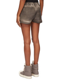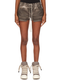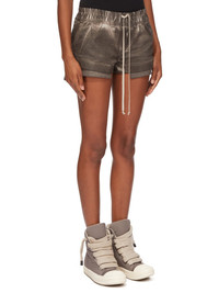 DRKSHDW SS25 HOLLYWOOD FOG BOXERS IN DARKDUST OVERDYED FOIL STRETCH DENIM THESE FOG BOXERS ARE CUT HIGH ON THE THIGH. THEY HAVE AN ELASTICIZED WAISTBAND WITH DRAWSTRING, SIDE WELT POCKETS AND SIDE SLITS. THIS LIGHTWEIGHT FOIL DENIM IS MADE ON A 10OZ STRETCH DENIM. THE READY GARMENT IS OVERDYED AND HAS A CLEAR, SEMI SHINY FOIL OVERLAY THAT CREATES A WAXY TOUCH SINCE THE FOIL IS PRESSED ON TOP OF THE FINAL GARMENTS, EACH PIECE WILL HAVE ITS OWN UNIQUE LOOK AND CREASES SINCE THE FOIL WILL ATTACH TO DIFFERENT PLACES DEPENDING ON THE GARMENT THIS GARMENT IS TREATED IN AN ITALIAN WASH HOUSE BASED IN THE VENETO AREA OF ITALY, THAT PRODUCES IN SMALLER TREATMENT BATHS TO REDUCE WATER WASTE AND UTILIZE A WATER PURIFYING PROCESS THAT ENABLES THEM TO RECYCLE A PORTION OF THE WATER USED. ALL OF OUR DENIM WASHES ARE ZDHC CERTIFIED. COLOR: DARKDUST MATERIAL: 90% COTTON + 7% POLYESTER + 3% RUBBER POCKETS LINING 52% POLYESTER + 48% COTTON MODEL IS 181CM TALL MODEL WEARS SIZE S