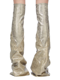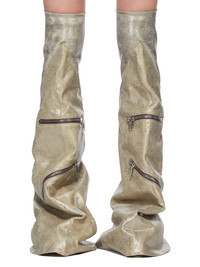 DRKSHDW FW25 CONCORDIANS CARGO FETISH IN PALLADIUM/MILK 13OZ FOIL DENIM THESE CARGO FETISH BOOTS ARE ABOVE-KNEE HIGH WITH A STRETCH LEATHER TOP. THEY HAVE A BOOT SHAPED UPPER WITH AN ADDITIONAL LAYER FALLING FROM AN ASYMMETRICAL SEAM LINE, GRAZING THE FLOOR. THEY FEATURE TWO FRONT ZIPPERS, ONE HORIZONTAL AND ONE ANGLED. THEY HAVE MILK TOE CAPS AND SHARK TOOTH SOLES. THIS MEDIUMWEIGHT 13OZ DENIM IS OVERDYED AND TREATED WITH A PALLADIUM FOIL OVERLAY AND WASHED TO ACHIEVE THE IRREGULAR LOOK SINCE THE FOIL IS PRESSED ON TOP OF THE FINAL GARMENTS, EACH PIECE WILL HAVE ITS OWN UNIQUE LOOK AND CREASES SINCE THE FOIL WILL ATTACH TO DIFFERENT PLACES DEPENDING ON THE GARMENT THIS FABRIC IS MADE USING GOTS CERTIFIED ORGANIC COTTON WHICH MEANS THE NATURAL FIBER IS GROWN WITHOUT HARMFUL CHEMICALS, LEAVING OUR SOIL, AIR AND WATER CLEANER FROM CONTAMINATES THIS GARMENT IS TREATED IN AN ITALIAN WASH HOUSE BASED IN THE VENETO AREA OF ITALY, THAT PRODUCES IN SMALLER TREATMENT BATHS TO REDUCE WATER WASTE AND UTILIZE A WATER PURIFYING PROCESS THAT ENABLES THEM TO RECYCLE A PORTION OF THE WATER USED. ALL OF OUR DENIM WASHES ARE ZDHC CERTIFIED COLOR: PALLADIUM/MILK MATERIAL: UPPER PART 90% COTTON + 7% POLYESTER + 3% RUBBER FIBER LOWER PART UPPER 100% COTTON TOE 70% POLYURETHANE + 30% VISCOSE SOLE HEIGHT 3.5CM