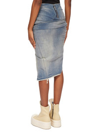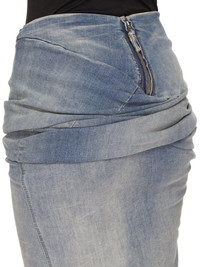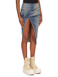 DRKSHDW SS25 HOLLYWOOD LOW TWIST SKIRT IN WASHED INDIGO WASHED INDIGO STRETCH DENIM THIS LOW TWIST MINI SKIRT IS ABOVE KNEE LENGTH, WITH A TIGHT FIT. IT HAS A HIGH WAIST WITH A BACK ZIPPER, AND TAPERED SKIRT. IT FEATURES AN OVER LAYER WHICH IS DESIGNED TO BE WORN SWEEPING FROM THE BACK, FOLDING ACROSS THE FRONT, AND ENDING IN A POINT ON THE RIGHT THIGH THIS LIGHTWEIGHT WASHED INDIGO DENIM IS MADE ON A 10OZ INDIGO AND NATURAL STRETCH DENIM. THE READY GARMENT IS WASHED WITH MINERALS TO ACHIEVE THE FINAL LOOK. THIS FABRIC IS MADE USING OCS CERTIFIED ORGANIC COTTON WHICH MEANS THE NATURAL FIBER IS GROWN WITHOUT HARMFUL CHEMICALS, LEAVING OUR SOIL, AIR AND WATER CLEANER FROM CONTAMINATES THIS GARMENT IS TREATED IN AN ITALIAN WASH HOUSE BASED IN THE VENETO AREA OF ITALY, THAT PRODUCES IN SMALLER TREATMENT BATHS TO REDUCE WATER WASTE AND UTILIZE A WATER PURIFYING PROCESS THAT ENABLES THEM TO RECYCLE A PORTION OF THE WATER USED. ALL OF OUR DENIM WASHES ARE ZDHC CERTIFIED COLOR: WASHED INDIGO MATERIAL: 91% COTTON + 6% ELASTOMULTIESTER + 3% RUBBER MODEL IS 181CM TALL MODEL WEARS SIZE S