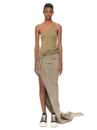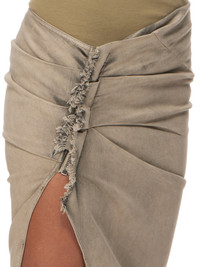 DRKSHDW FW23 LUXOR EDFU SKIRT LONG IN MINERAL PEARL STRETCH DENIM THIS EDFU SKIRT LONG TRAILS FLOOR-LENGTH. IT IS A TRIANGULAR WRAP AROUND SHAPE, SLOPING FROM GATHERED DRAPING THAT CREATES A SHORT WINGED RUFFLE ON THE RIGHT HIP. FROM THERE ITS HIGH SPLIT SLOPES INTO A SLIGHTLY TAPERED HEM. IT OPENS WITH A SIDE ZIPPER BEHIND THE RUFFLE. THIS LIGHTWEIGHT INDIGO STRETCH DENIM IS GARMENT TREATED WITH A MINERAL PEARL FINISH. THE GARMENT IS FIRST STONE WASHED AND THEN OVERDYED WITH A NATURAL MINERAL COLOR THIS GARMENT IS TREATED IN AN ITALIAN WASH HOUSE BASED IN THE VENETO AREA OF ITALY, THAT PRODUCES IN SMALLER TREATMENT BATHS TO REDUCE WATER WASTE AND UTILIZE A WATER PURIFYING PROCESS THAT ENABLES THEM TO RECYCLE A PORTION OF THE WATER USED. ALL OF OUR DENIM WASHES ARE ZDHC CERTIFIED - COLOR: MINERAL PEARL - MATERIAL: 91% COTTON + 6% ELASTOMULTIESTER + 3% RUBBER - MODEL IS WEARING SIZE S - MODEL IS 181 CM TALL