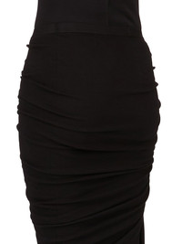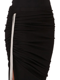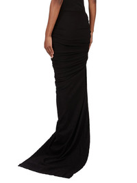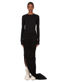 RICK OWENS FW25 CONCORDIANS EDFU SKIRT IN BLACK DOUBLE BRUSHED JERSEY THIS EDFU SKIRT TRAILS FLOOR LENGTH AND HAS A LONG TRAIN. IT HAS AN ELASTICIZED WAISTBAND A TIGHT FIT. IT DRAPES AND WRAPS AROUND THE HIPS, AND GATHERS INTO A SEAM ON THE RIGHT THIGH. THE SIDE SPLIT CAN BE MODIFIED USING THE DRAWSTRING. A HIGHER, OR LOWER, SPLIT CREATES INCREASED DRAPING AND RUCHING. ITS TRAIN TAPERS TO A NARROW, FLOOR TRAILING TIP THIS MEDIUMWEIGHT COTTON JERSEY IS BRUSHED ON BOTH SIDES WHICH GIVES THE FABRIC A SOFT AND PEACHY HANDFEEL. THIS JERSEY IS GARMENT DYED THIS FABRIC IS MADE USING GOTS CERTIFIED ORGANIC COTTON WHICH MEANS THE NATURAL FIBER IS GROWN WITHOUT HARMFUL CHEMICALS, LEAVING OUR SOIL, AIR AND WATER CLEANER FROM CONTAMINATES COLOR: BLACK MATERIAL: 100% COTTON MODEL IS 181CM TALL MODEL WEARS SIZE 40