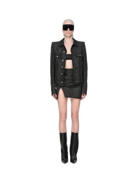 DRKSHDW SS26 TEMPLE PULL ON SLICED PILLAR SKIRT IN BLACK MEDIUM WEIGHT COTTON JERSEY THIS PULL ON SLICED PILLAR SKIRT IS ANKLE LENGTH AT SIDES. IT HAS AN ELASTICIZED WAIST AND DRAWSTRING AND A CLOSE TO THE BODY FIT. IT FEATURES TWO HIGH SLITS FRONT AND BACK WITH RAW CUT EDGES, AS WELL AS A FRONT AND BACK RIDGE STITCH DETAIL. IT HAS SIDE SEAM POCKETS. THIS MEDIUMWEIGHT COTTON JERSEY HAS A COMPACT AND DRY HANDFEEL. THIS JERSEY IS GARMENT DYED. THIS FABRIC IS MADE USING GOTS CERTIFIED ORGANIC COTTON WHICH MEANS THE NATURAL FIBER IS GROWN WITHOUT HARMFUL CHEMICALS, LEAVING OUR SOIL, AIR AND WATER CLEANER FROM CONTAMINATES. COLOR: BLACK MATERIAL:100% COTTON MODEL IS 181CM TALL MODEL WEARS SIZE S