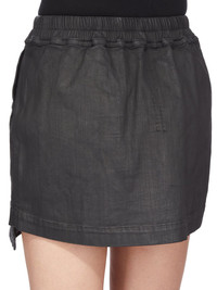 DRKSHDW FW25 CONCORDIANS FOG MINI SKIRT IN BLACK WAX STRETCH DENIM THIS FOG MINI SKIRT IS MID-THIGH LENGTH WITH VISIBLE HANGING POCKETS. THEY HAVE AN ELASTICIZED WAISTBAND WITH DRAWSTRING AND SIDE WELT POCKETS. THIS LIGHTWEIGHT BLACK WAX DENIM IS MADE ON A 10OZ BLACK AND NATURAL STRETCH DENIM. THE READY GARMENT IS OVERDYED BLACK AND TREATED WITH A WAX FINISH. A FINAL WASH GIVES THIS GARMENT ITS SOFTNESS THIS GARMENT IS TREATED IN AN ITALIAN WASH HOUSE BASED IN THE VENETO AREA OF ITALY, THAT PRODUCES IN SMALLER TREATMENT BATHS TO REDUCE WATER WASTE AND UTILIZE A WATER PURIFYING PROCESS THAT ENABLES THEM TO RECYCLE A PORTION OF THE WATER USED. ALL OF OUR DENIM WASHES ARE ZDHC CERTIFIED COLOR: BLACK WAX MATERIAL: 91% COTTON + 6% ELASTOMULTIESTER + 3% RUBBER FIBER POCKETS LINING 52% POLYESTER + 48% COTTON MODEL IS 181CM TALL MODEL WEARS SIZE S