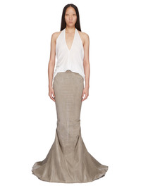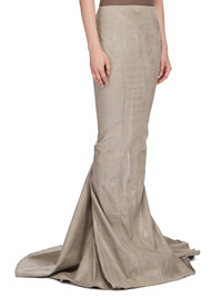 DRKSHDW SS24 LIDO AL PILLAR SKIRT IN PEARL OVERDYED FOIL STRETCH DENIM THIS AL PILLAR SKIRT IS ANKLE-LENGTH WITH A TIGHT FIT. IT HAS AN EXTRA HIGH WAIST AND SEAMS CURVING OVER THE HIPS, AND DOWN THE FRONT LEG, TO THE HEM. IT IS TIGHT TO THE KNEE AND THEN FLARES INTO A FISHTAIL TRAIN AT CENTRE BACK AND HAS A RAW CUT HEM THIS LIGHTWEIGHT STRETCH DENIM IS OVERDYED WITH A CLEAR FOIL OVERLAY THAT CREATES THE WAXY TOUCH. THIS GARMENT IS TREATED IN AN ITALIAN WASH HOUSE BASED IN THE VENETO AREA OF ITALY, THAT PRODUCES IN SMALLER TREATMENT BATHS TO REDUCE WATER WASTE AND UTILIZE A WATER PURIFYING PROCESS THAT ENABLES THEM TO RECYCLE A PORTION OF THE WATER USED. ALL OF OUR DENIM WASHES ARE ZDHC CERTIFIED - COLOR: PEARL - MATERIAL: 90% COTTON + 7% POLYESTER + 3% RUBBER - MODEL IS 181CM TALL - MODEL WEARS SIZE S