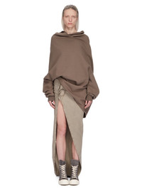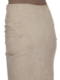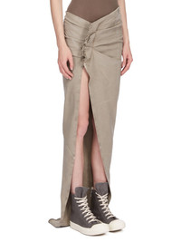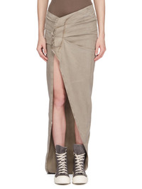 DRKSHDW SS24 LIDO DENIM EDFU SKIRT LONG IN PEARL OVERDYED FOIL STRETCH DENIM THIS DENIM EDFU SKIRT LONG TRAILS FLOOR-LENGTH. IT IS A TRIANGULAR WRAP AROUND SHAPE, SLOPING FROM GATHERED DRAPING THAT CREATES A SHORT WINGED RUFFLE ON THE RIGHT HIP. FROM THERE ITS HIGH SPLIT SLOPES INTO A SLIGHTLY TAPERED HEM. IT OPENS WITH A SIDE ZIPPER BEHIND THE RUFFLE. THIS LIGHTWEIGHT STRETCH DENIM IS OVERDYED WITH A CLEAR FOIL OVERLAY THAT CREATES THE WAXY TOUCH. THIS GARMENT IS TREATED IN AN ITALIAN WASH HOUSE BASED IN THE VENETO AREA OF ITALY, THAT PRODUCES IN SMALLER TREATMENT BATHS TO REDUCE WATER WASTE AND UTILIZE A WATER PURIFYING PROCESS THAT ENABLES THEM TO RECYCLE A PORTION OF THE WATER USED. ALL OF OUR DENIM WASHES ARE ZDHC CERTIFIED - COLOR: PEARL - MATERIAL: 90% COTTON + 7% POLYESTER + 3% RUBBER - MODEL IS 181CM TALL - MODEL WEARS SIZE S