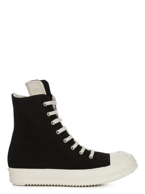 DRKSHDW FW25 CONCORDIANS SNEAKS IN BLACK/MILK 13OZ OVERDYED DENIM THESE SNEAKS ARE ABOVE ANKLE HEIGHT AND FEATURE EIGHT EYELETS, LACES, A ZIPPER ON THE INSIDE ANKLE FOR EASY FASTENING, TOE CAPS AND SHARK TOOTH SOLES. THIS MEDIUMWEIGHT 13OZ DENIM IS OVERDYED AND HAS A SOFT AND WASHED HANDFEEL THIS FABRIC IS MADE USING GOTS CERTIFIED ORGANIC COTTON WHICH MEANS THE NATURAL FIBER IS GROWN WITHOUT HARMFUL CHEMICALS, LEAVING OUR SOIL, AIR AND WATER CLEANER FROM CONTAMINATES COLOR: BLACK/MILK MATERIAL: UPPER 100% COTTON TOE 70% POLYURETHANE + 30% VISCOSE LINING 100% COTTON SOLE HEIGHT 3.5CM