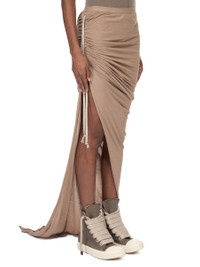 DRKSHDW SS26 TEMPLE SOFT EDFU SKIRT IN FLESH COTTON GAUZE JERSEY THIS SOFT EDFU SKIRT TRAILS FLOOR LENGTH AT BACK AND LEFT SIDE. IT HAS AN ELASTICIZED WAISTBAND A TIGHT FIT. IT DRAPES AND WRAPS AROUND THE HIPS AND GATHERS INTO A SEAM ON THE RIGHT THIGH. THE SIDE SPLIT CAN BE MODIFIED USING THE DRAWSTRING. A HIGHER, OR LOWER, SPLIT CREATES INCREASED DRAPING AND RUCHING. THIS LIGHTWEIGHT AND AIRY COTTON GAUZE JERSEY IS SEMI TRANSPARENT AND HAVE A SOFT WASHED HAND FEEL. THIS JERSEY IS GARMENT DYED. THIS FABRIC IS MADE USING GOTS CERTIFIED ORGANIC COTTON WHICH MEANS THE NATURAL FIBER IS GROWN WITHOUT HARMFUL CHEMICALS, LEAVING OUR SOIL, AIR AND WATER CLEANER FROM CONTAMINATES. COLOR: FLESH MATERIAL:100% COTTON MODEL IS 181CM TALL MODEL WEARS SIZE S