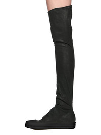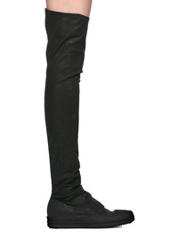DRKSHDW SS25 HOLLYWOOD HIGH SOCK SNEAKS IN DARK BLACK/BLACK/BLACK OVERDYED FOIL STRETCH DENIM THESE HIGH SOCKS SNEAKS ARE MID-THIGH HEIGHT. THEY HAVE STRETCH DENIM STOCKING UPPERS, WITH DRAPING AROUND THE UPPER FOOT AND ANKLE, TOE CAPS AND SHARK-TOOTH SOLES THIS LIGHTWEIGHT FOIL DENIM IS MADE ON A 10OZ STRETCH DENIM. THE READY GARMENT IS OVERDYED AND HAS A CLEAR, SEMI SHINY FOIL OVERLAY THAT CREATES A WAXY TOUCH SINCE THE FOIL IS PRESSED ON TOP OF THE FINAL GARMENTS, EACH PIECE WILL HAVE ITS OWN UNIQUE LOOK AND CREASES SINCE THE FOIL WILL ATTACH TO DIFFERENT PLACES DEPENDING ON THE GARMENT THIS GARMENT IS TREATED IN AN ITALIAN WASH HOUSE BASED IN THE VENETO AREA OF ITALY, THAT PRODUCES IN SMALLER TREATMENT BATHS TO REDUCE WATER WASTE AND UTILIZE A WATER PURIFYING PROCESS THAT ENABLES THEM TO RECYCLE A PORTION OF THE WATER USED. ALL OF OUR DENIM WASHES ARE ZDHC CERTIFIED. COLOR: BLACK/BLACK/BLACK MATERIAL: UPPER 90% COTTON + 7% POLYESTER + 3% RUBBER TOE 70% POLYURETHANE + 30% VISCOSE SOLE 100% THERMOPLASTIC RUB SOLE HEIGHT 3.5CM
