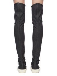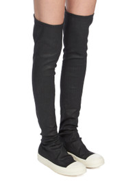 DRKSHDW FW25 CONCORDIANS HIGH SOCK SNEAKS IN BLACK WAX/MILK/MILK STRETCH DENIM THESE HIGH SOCK SNEAKS ARE MID-THIGH HEIGHT. THEY HAVE STRETCH DENIM STOCKING UPPERS, WITH DRAPING AROUND THE UPPER FOOT AND ANKLE, TOE CAPS AND SHARK TOOTH SOLES. THIS LIGHTWEIGHT BLACK WAX DENIM IS MADE ON A 10OZ BLACK AND NATURAL STRETCH DENIM. THE READY GARMENT IS OVERDYED BLACK AND TREATED WITH A WAX FINISH. A FINAL WASH GIVES THIS GARMENT ITS SOFTNESS. THIS GARMENT IS TREATED IN AN ITALIAN WASH HOUSE BASED IN THE VENETO AREA OF ITALY, THAT PRODUCES IN SMALLER TREATMENT BATHS TO REDUCE WATER WASTE AND UTILIZE A WATER PURIFYING PROCESS THAT ENABLES THEM TO RECYCLE A PORTION OF THE WATER USED. ALL OF OUR DENIM WASHES ARE ZDHC CERTIFIED. COLOR: BLACK WAX/MILK/MILK MATERIAL: UPPER 91% COTTON + 6% ELASTOMULTIESTER + 3% RUBBER FIBER TOE 70% POLYURETHANE + 30% VISCOSE SOLE HEIGHT 3.5CM