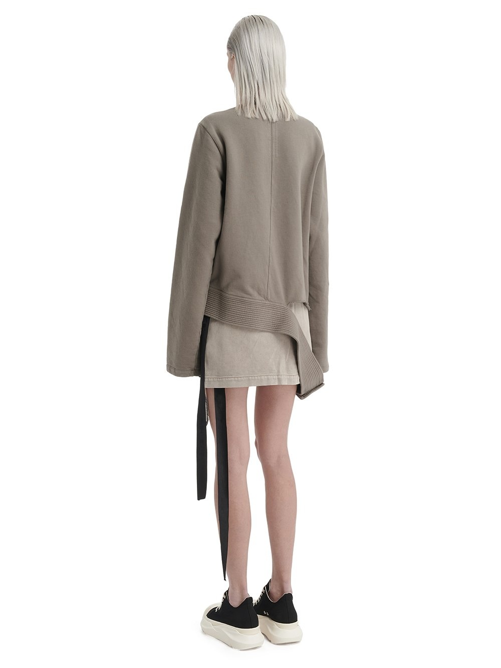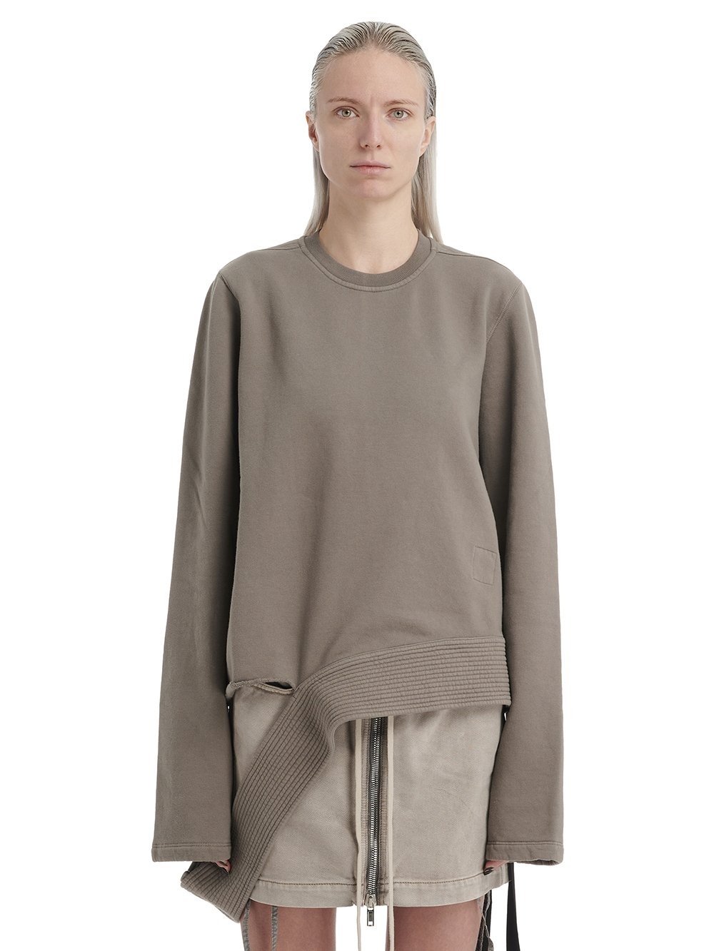 RICK OWENS FW21 GETHSEMANE LONG CREATCH SWEAT IN FURKA HEAVY SWEATSHIRT THIS LONG CREATCH SWEAT IS HIP LENGTH WITH A RIBBED CREW NECK AND LONG SLEEVES. IT FEATURES A SIGNATURE MULTI-LINE STITCH WAISTBAND WITH VELCRO FASTENING THAT IS RIPPED FROM THE SWEAT HEM AND HANGS DOWN ON THE RIGHT HAND SIDE THIS HEAVYWEIGHT COTTON SWEATSHIRT JERSEY IS GARMENT DYED WITH A SOFT BRUSHED REVERSE SIDE.THIS JERSEY IS MADE FROM GOTS CERTIFIED ORGANIC COTTON. WE CHOSE TO MAKE THIS GARMENT USING CERTIFIED ORGANIC COTTON BECAUSE IT MEANS THE NATURAL FIBER IS GROWN WITHOUT HARMFUL CHEMICALS, WHICH LEAVES OUR SOIL, AIR AND WATER CLEANER FROM CONTAMINATES - COLOR: DUST - MATERIAL:. 100% COTTON - MODEL IS WEARING SIZE S - MODEL IS 181 CM TALL