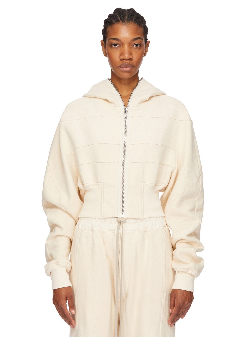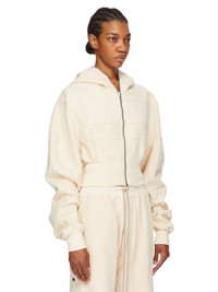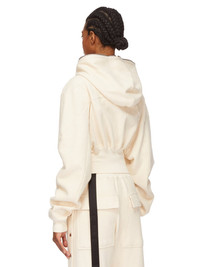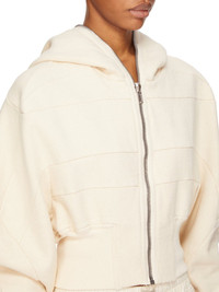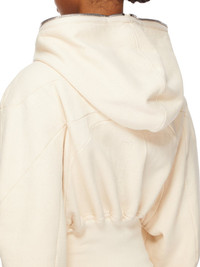 DRKSHDW SS25 HOLLYWOOD COLLAGE GIMP HOODIE IN NATURAL FURKA HEAVY SWEATSHIRT THIS COLLAGE GIMP HOODIE IS CROPPED WAIST LENGTH AND HAS LONG SLEEVES. IT HAS A FRONT ZIPPER CLOSURE WITH EXPOSED ZIPPER TAPE THAT RUNS FROM THE HEM ALL THE WAY UP THROUGH THE HOOD, ALLOWING IT TO BE ZIPPERED COMPLETELY CLOSED OVER THE FACE. IT FEATURES GEOMETRIC GIRDERED SHOULDERS, AND STITCHING, A FRONT AND BACK YOKE AND HAS RIBBED CUFFS AND WIDE WAISTBAND THIS HEAVYWEIGHT COTTON SWEATSHIRT JERSEY HAS A SOFT AND WASHED HANDFEEL. THE COLOR OF THIS JERSEY IS NATURAL WITH VISIBLE SLUBS AND IMPURITIES NATURAL TO THE COTTON FIBRE. THIS JERSEY IS GARMENT WASHED. THIS FABRIC IS MADE USING GOTS CERTIFIED ORGANIC COTTON WHICH MEANS THE NATURAL FIBER IS GROWN WITHOUT HARMFUL CHEMICALS, LEAVING OUR SOIL, AIR AND WATER CLEANER FROM CONTAMINATES COLOR: NATURAL MATERIAL: 100% COTTON MODEL IS 181CM TALL MODEL WEARS SIZE S