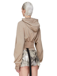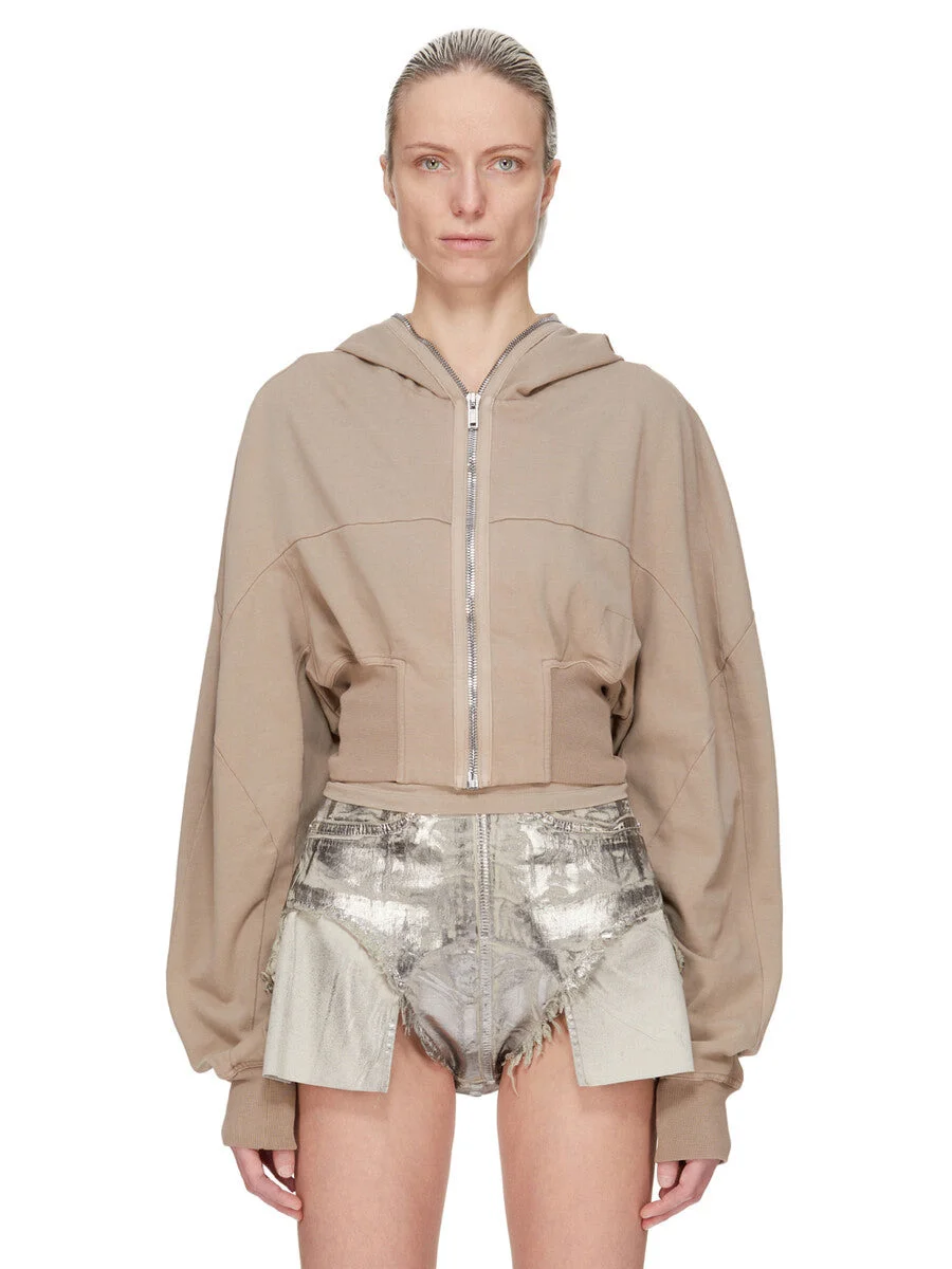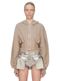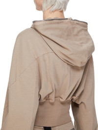 DRKSHDW FW25 CONCORDIANS COLLAGE GIMP HOODIE IN DIRTY PEARL COMPACT HEAVY JERSEY THIS COLLAGE GIMP HOODIE IS CROPPED WAIST LENGTH AND HAS LONG SLEEVES. IT HAS A FRONT ZIPPER CLOSURE WITH EXPOSED ZIPPER TAPE THAT RUNS FROM THE HEM ALL THE WAY UP THROUGH THE HOOD, ALLOWING IT TO BE ZIPPERED COMPLETELY CLOSED OVER THE FACE. IT FEATURES GEOMETRIC GIRDERED SHOULDERS AND STITCHING, A FRONT AND BACK YOKE AND HAS RIBBED CUFFS AND WIDE WAISTBAND. THIS HEAVYWEIGHT AND COMPACT COTTON JERSEY HAS A BRUSHED AND SOFT HANDFEEL. THIS JERSEY IS GARMENT DYED. THIS FABRIC IS MADE USING GOTS CERTIFIED ORGANIC COTTON WHICH MEANS THE NATURAL FIBER IS GROWN WITHOUT HARMFUL CHEMICALS, LEAVING OUR SOIL, AIR AND WATER CLEANER FROM CONTAMINATES. COLOR: DIRTY PEARL MATERIAL: 100% COTTON MODEL IS 181CM TALL MODEL WEARS SIZE S